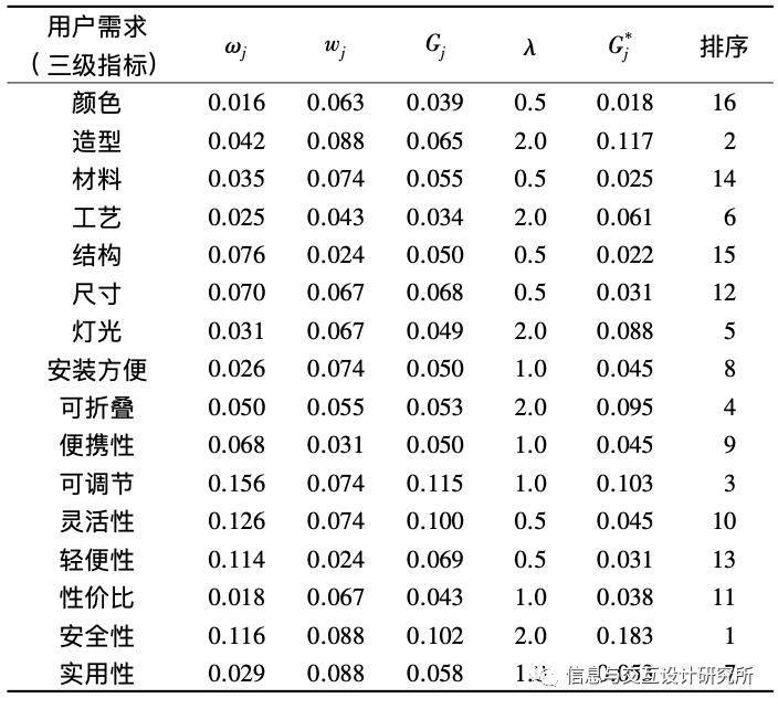 中用户需求类别A、O、M、I一一对应(因R为逆向需求,此处不作考虑),则调整系数λ的值分别为2、1、0.5和0。最终权重Gj*可反映出用户需求重要度优先排序情况,将其作为产品创新设计的参考依据。