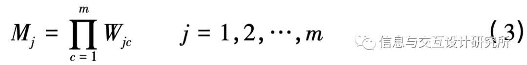 1)对判断矩阵M( m行xm列)中每行数值进行累乘,其中共有m个评价指标,累乘后结果为M;,即: