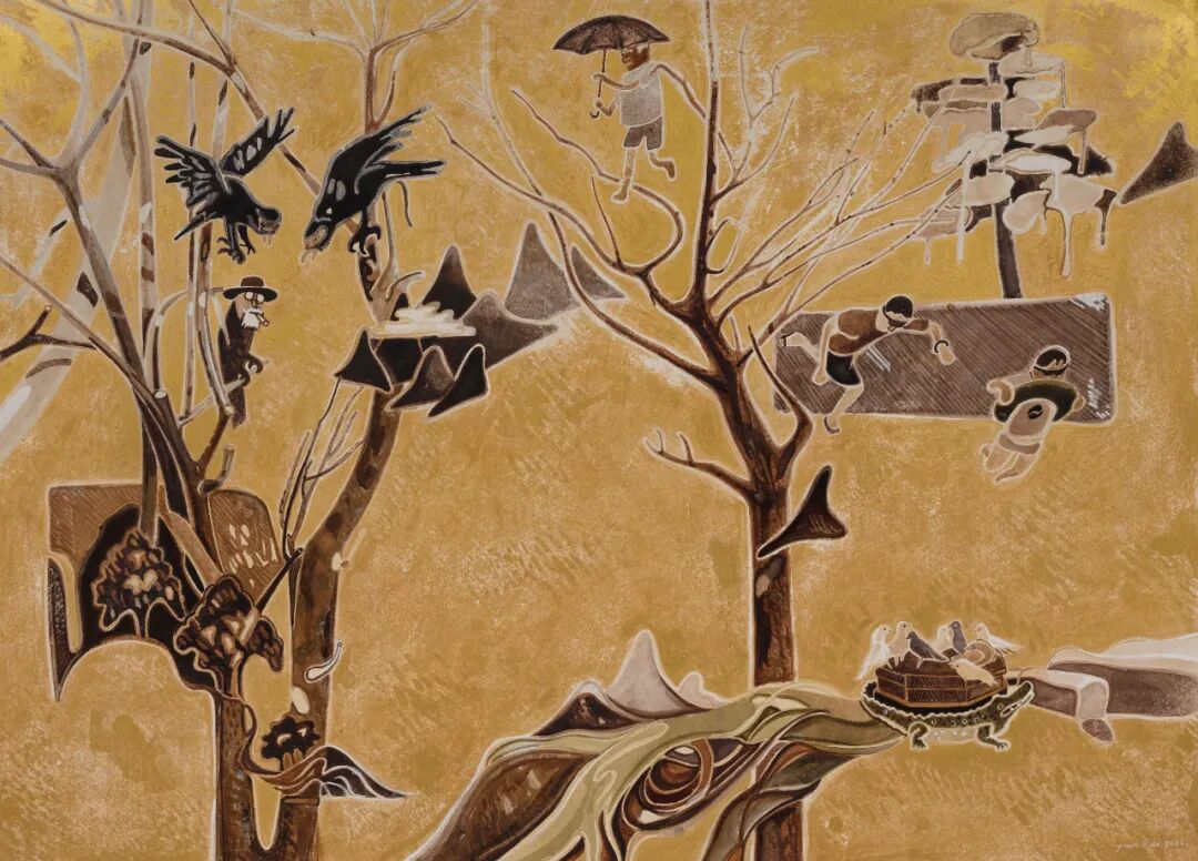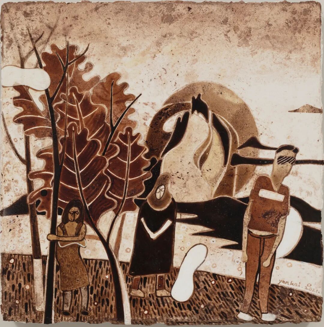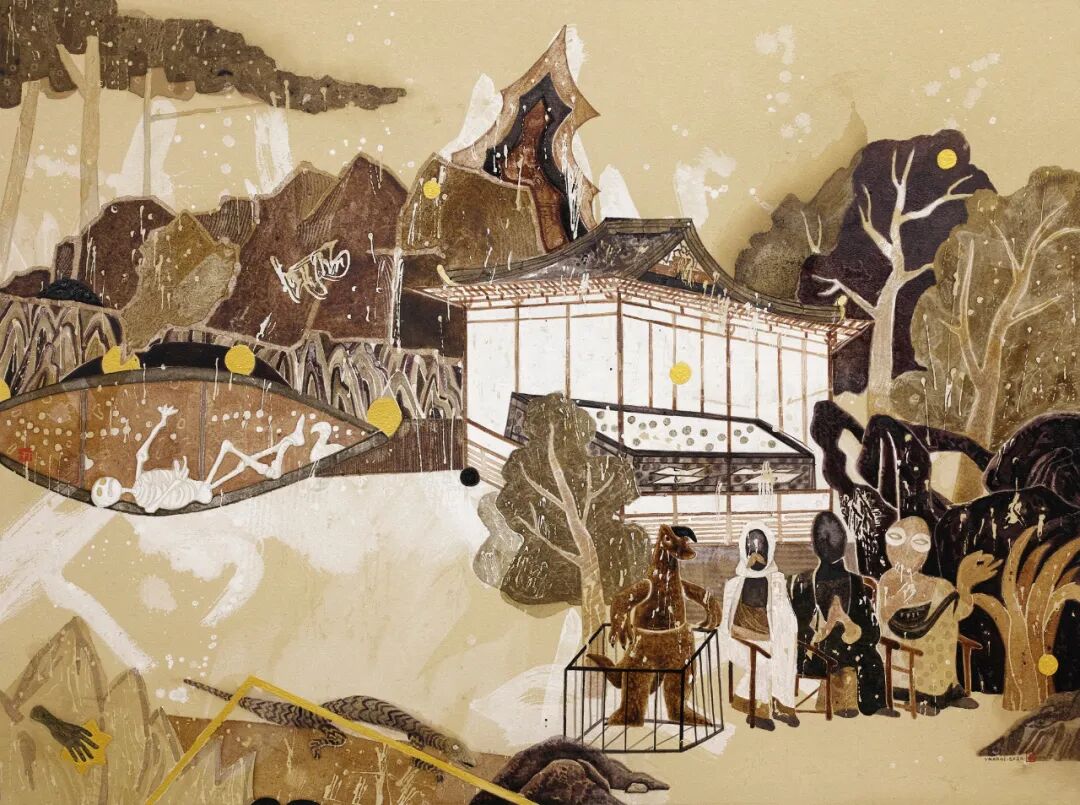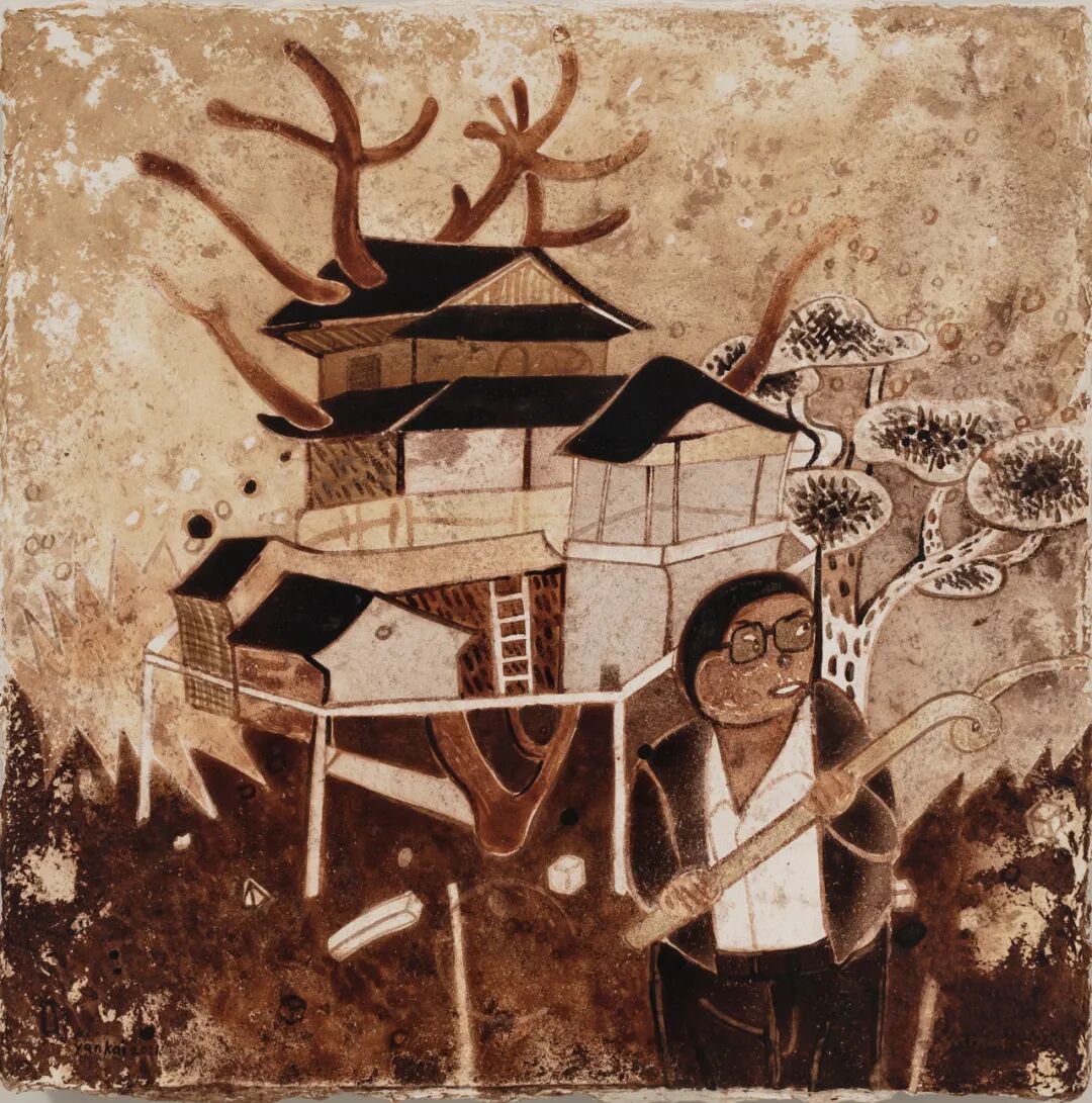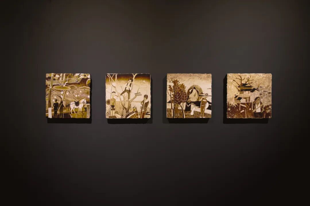 我们可以从《品茶论道》《林间奇谈》、《茶山》系列、《黄梁旧梦》《游园惊梦》等看到一些对中国传统题材再创新的痕迹。颜开选择茶文化的题材切入,运用茶具及茶道展现出“茶器之气”。通过作品,提出一些介于已知与未知、现实与幻梦虚实的融合,挑战中国传统文人对于神话题材的臆想,超越写实意象,创造出属于颜开自己的神话世界,《临敦煌壁画》《灵兽志异》《坐山虎》《不稳定的风景》等,表达的是“大自然蕴含的美”以及“以人为本”的创造力。