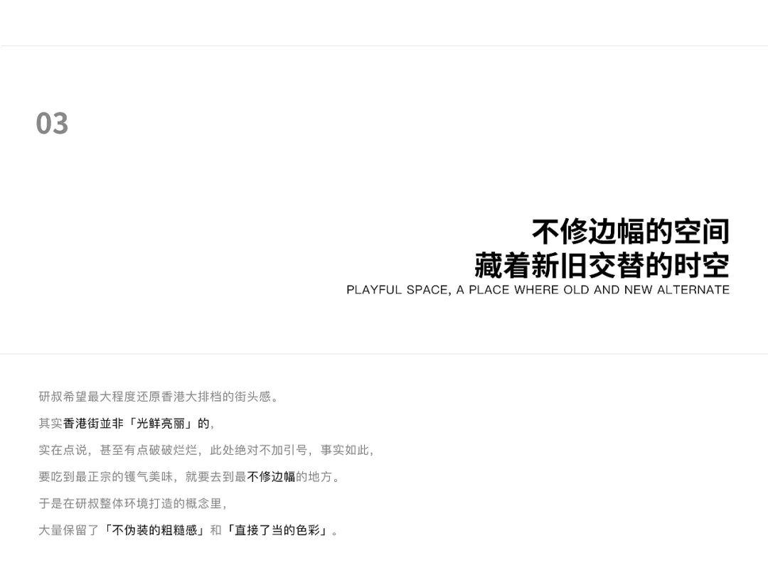 最地道、正宗的镬气美味,并非是“光鲜亮丽”的,就餐的环境甚至是“破破烂烂”、“不修边幅”的。于是在研叔整体环境打造的概念里,大量保留了不伪装的粗糙感和直接了当的色彩,把独特的港味带到品牌中。