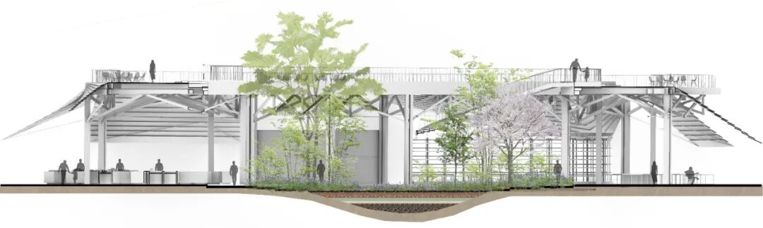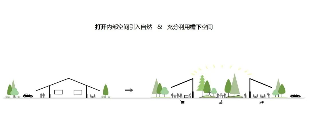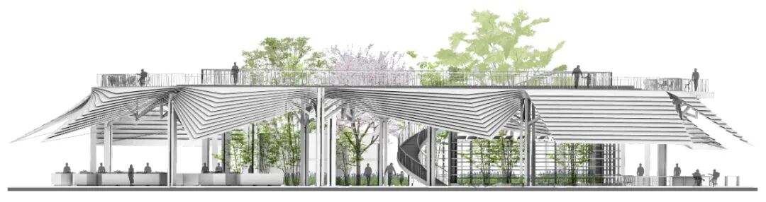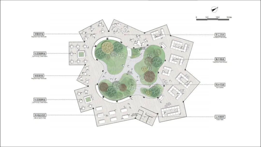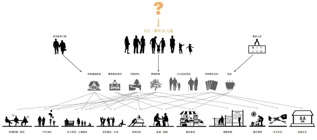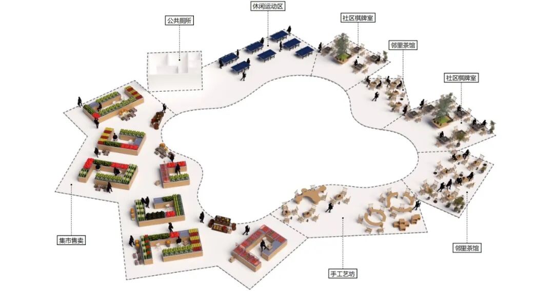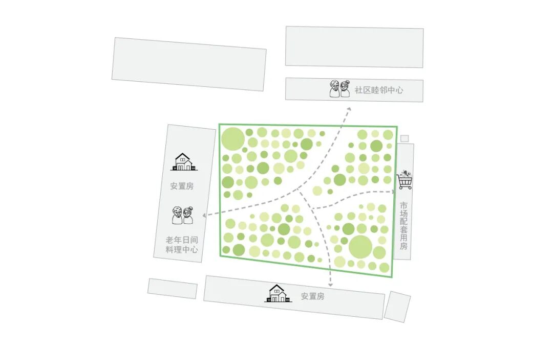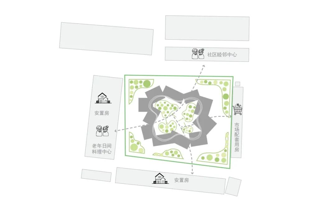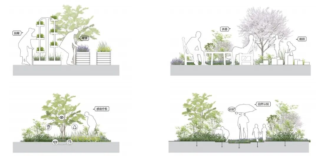 世代花园,是一个中心花园,也是社区跨年龄交流的主要场所,各年龄层的人在此相遇、交流。将疗愈景观融入其中,打造 DIY 园艺空间、自然休息空间、感官疗愈空间、自然认知空间等, 通过多重方式促进老年人活动,刺激其各项身体机能,提高老龄人群身体活动力,促进血液循环,增强身体免疫力。在内庭花园中预留场地给老人摆放自己的盆栽植物,激发他们的劳动欲望,这样有利于老人的身体和情绪。