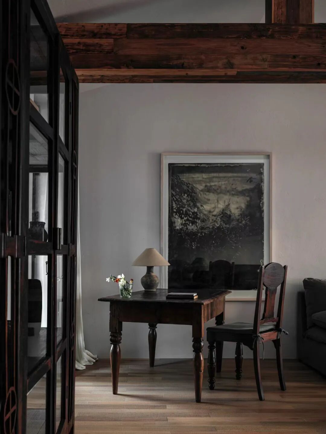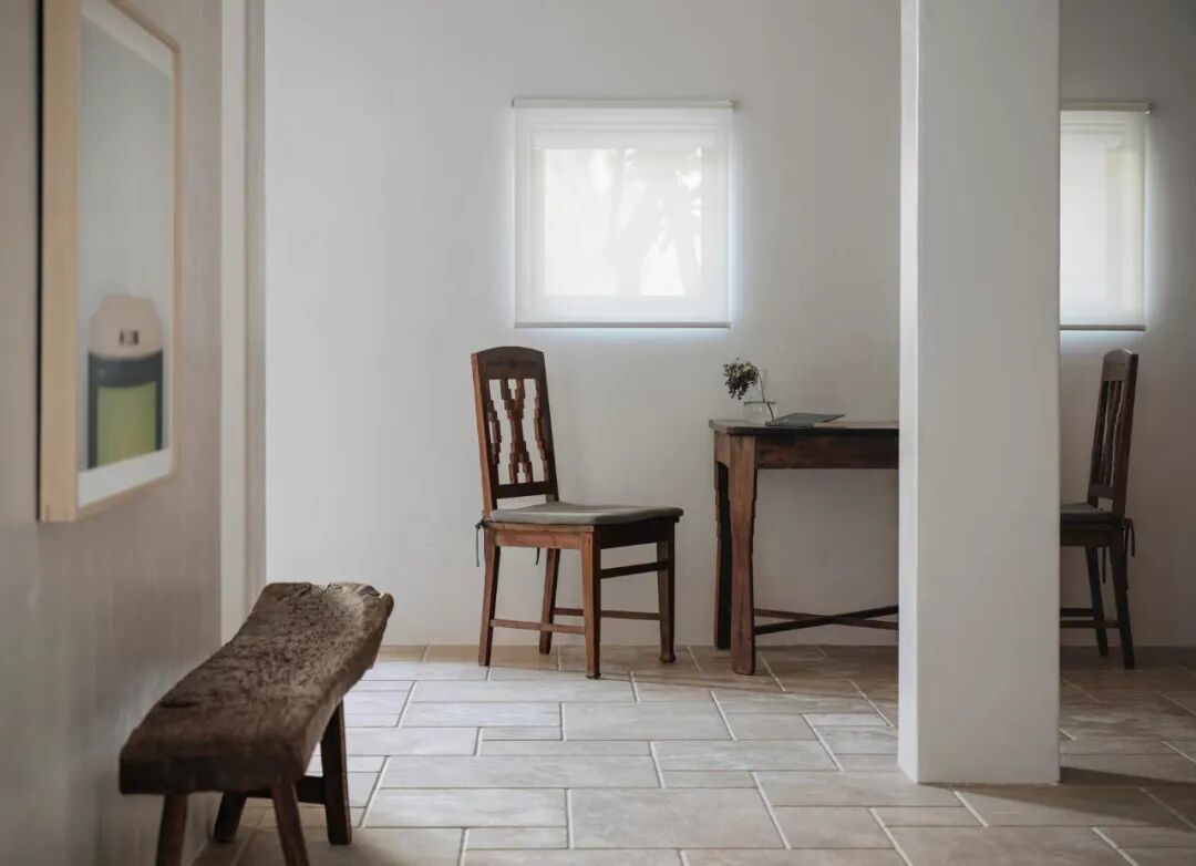 室内家具及收藏品,大多择选自壹集。古而承新,皆是有时间感的物品:天然亚麻沙发、温润的木质单椅及孤品茶几、来自于出身在非洲的抽象派艺术家Kader.Boly的画作...... 尤爱民间的艺术,它们带有某种诙谐趣味,充满原始的生命力,那是设计师很难制作出的朴实与自在。
