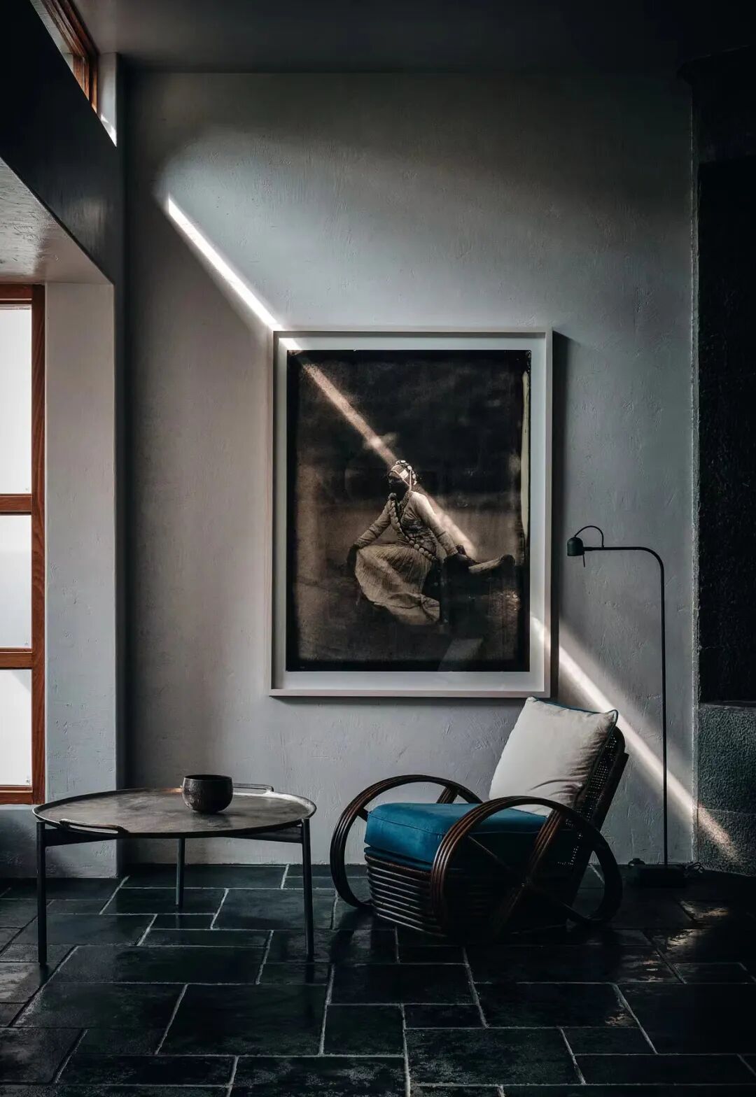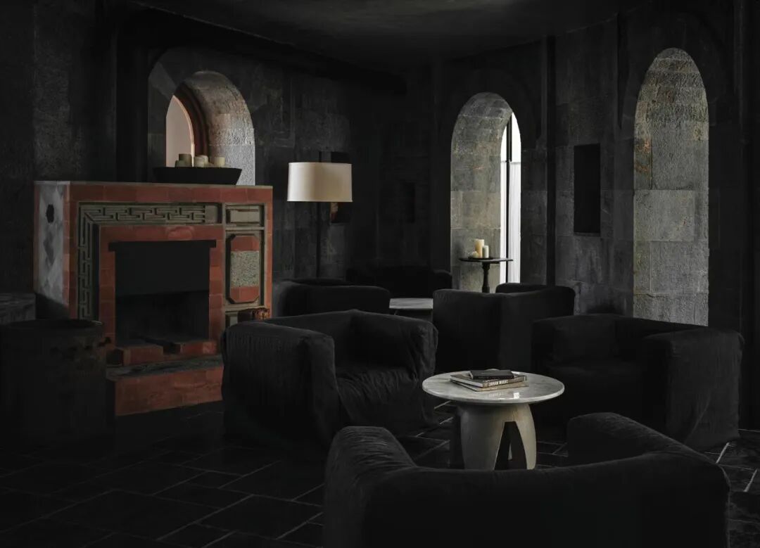 在褐色与深灰色的地面石材映衬下,古旧、具有中西合璧趣味的深色家具,散发出深邃的光芒,美国使馆武官别墅后院的私家露天泳池变成一汪水塘映着天光,这里绿植充盈,成为可休憩的隐秘花园。