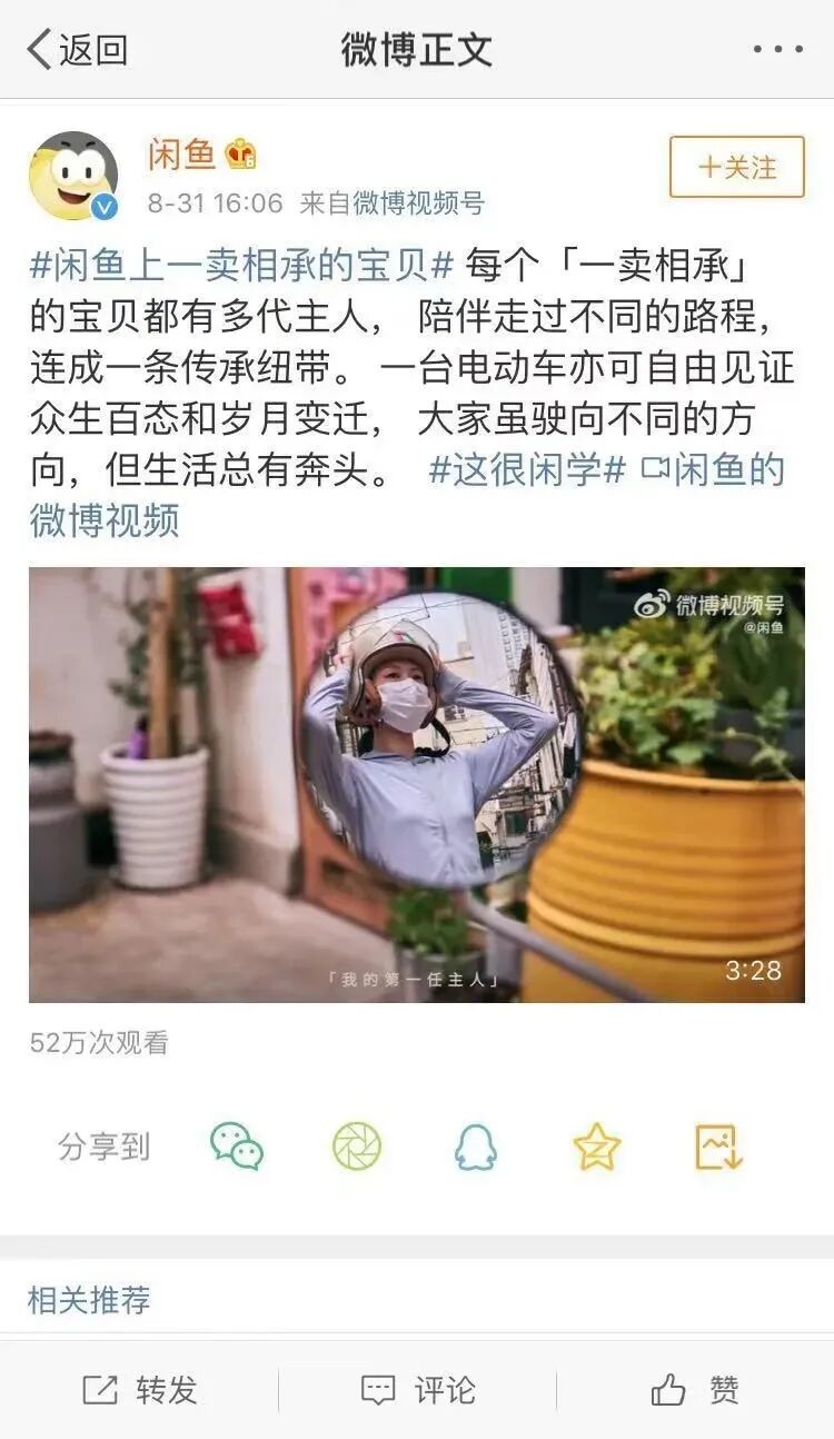 短短3分钟,却好像看见了众生百态......8月30日,闲鱼官微发布《我在闲鱼“一卖相承”的故事》,通过一辆八手电动车的奇幻沪漂,看似平平无奇,却又八代相承,见证了有人从两轮变成双脚,也有人从两轮到四轮。
