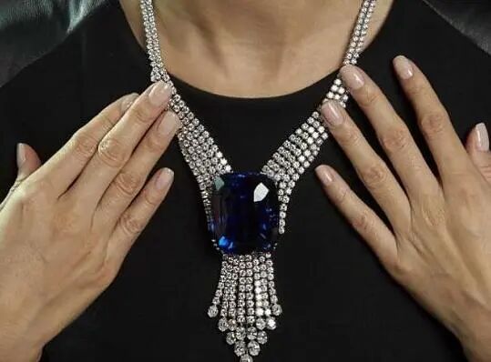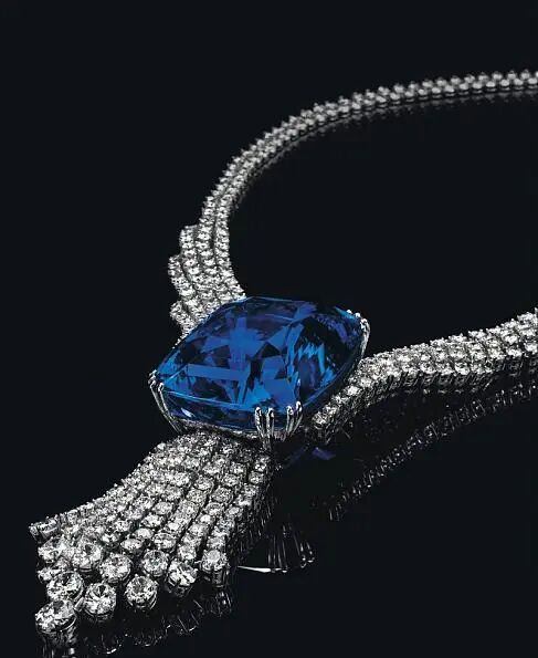 这颗绝美斯里兰卡蓝宝石镶嵌于钻石项链之上,重达392.52克拉,一经现身便引发了藏家的激烈竞夺