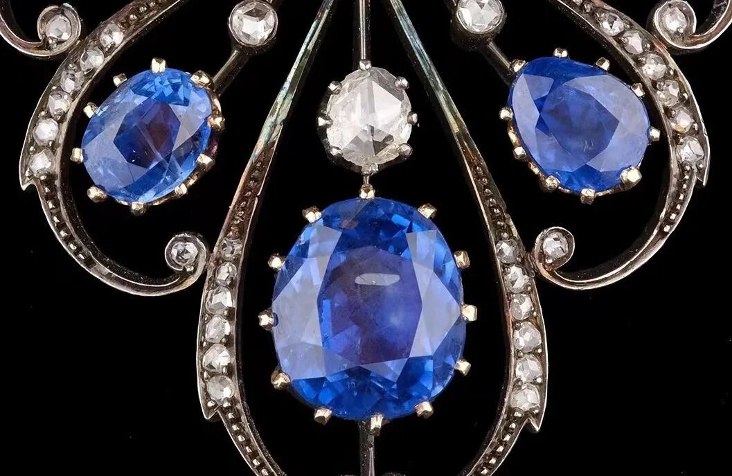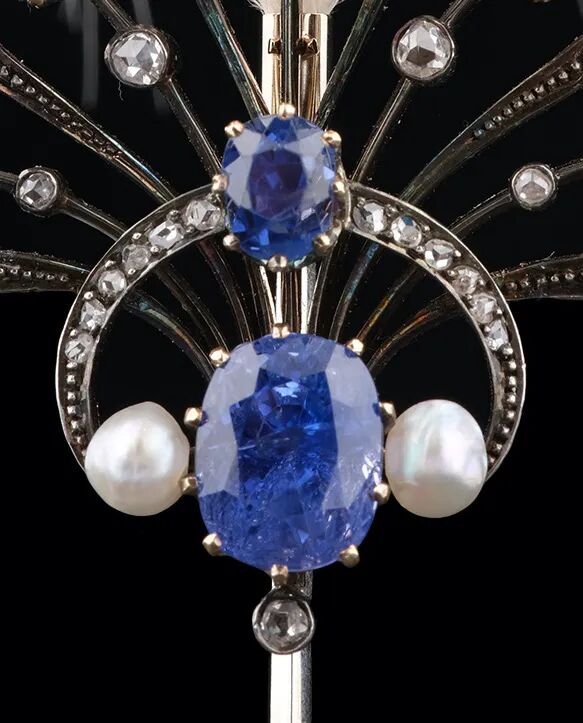 此件古董冠冕珠宝,整体以传统金银叠工艺打造出纤细花结造型,中央主石部分则以黄金华美镶嵌,深邃迷人的斯里兰卡天然无烧蓝宝石莹泽通透,钻石在细节轮廓绽放柔光,处处彰显着世纪之交的独特魅力。