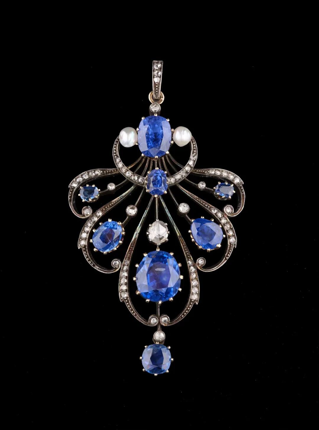 此件冠冕珠宝/吊坠的八颗蓝宝石总重达30克拉,其中六颗为斯里兰卡蓝宝石,均为无烧,最大程度保留了蓝宝石原有的净度和色彩,彰显矜贵不凡。