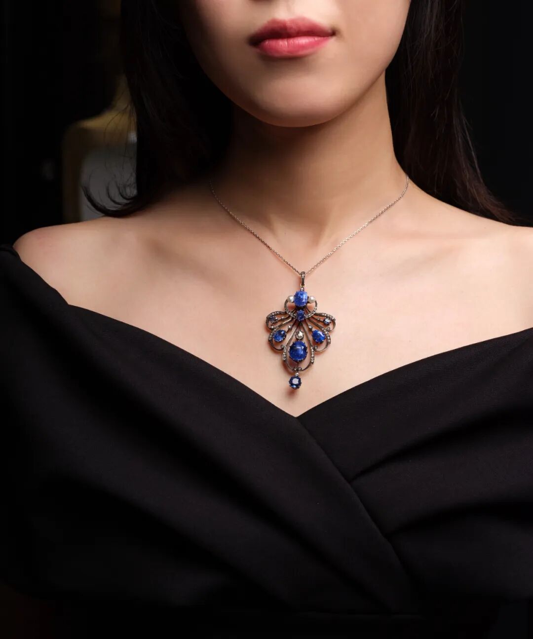深邃蓝宝与天然莹珠更衬羽翼之美