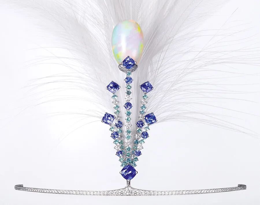 尚美Aigrette白鹭冠,镶有钻石、欧泊宝石、蓝碧玺和坦桑石,将20世纪初的羽毛头饰经典复刻