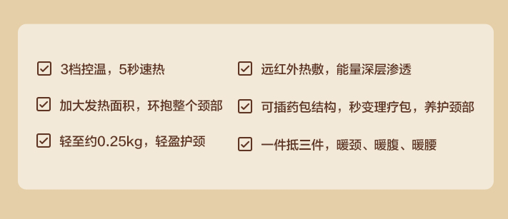 42℃低温档:可以应对室内室外、早晚温差,适合日常颈部保暖;
