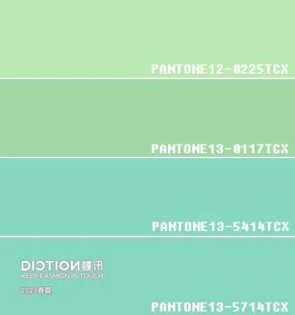 绿色在今个季度表现力十分多元且丰富,如冰河蓝-12-5505TCX、豚草绿-12-0109TCX、阴霾蓝-15-4707TCX、铜锈绿-12-0225TCX、电绿色-14-5721TCX 等视觉感体现十分清爽纯粹,尤其在热度爆表的高温夏季带来一丝冰爽感具备极高的吸引力。