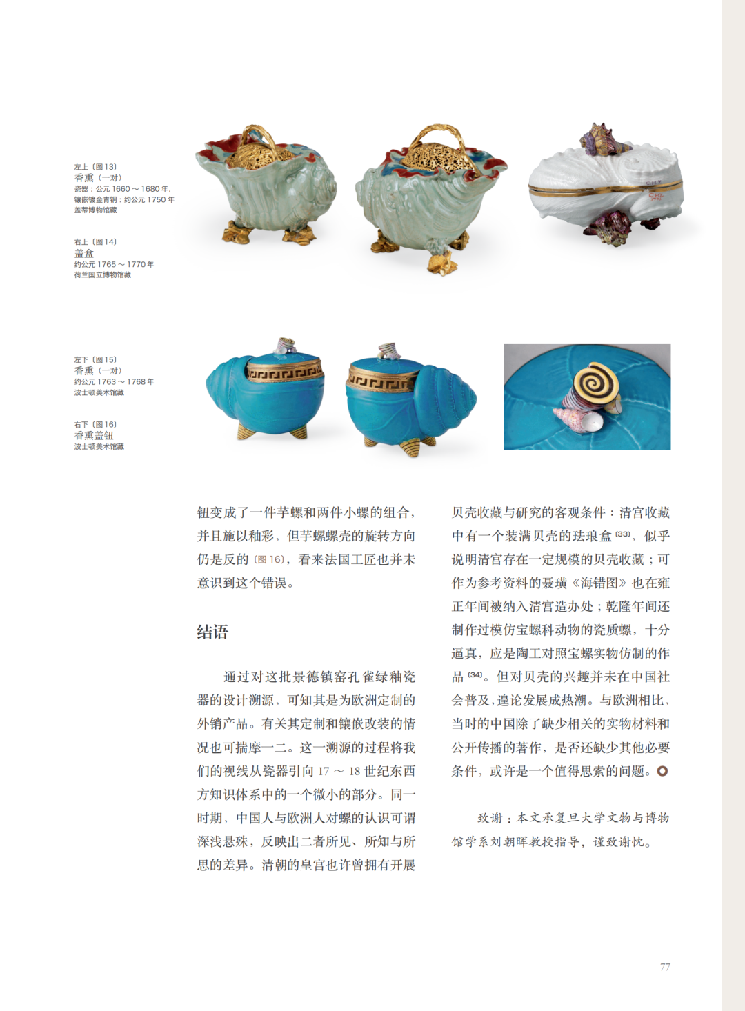 ▶ 外销瓷往往具有独特的风韵,是研究中西文化交流的理想媒介。本文作者对一组流入欧洲、罕见于国内的清初景德镇窑孔雀绿釉螺形器的形状与纹饰进行分析,认为其设计应源自欧洲,并探讨了同时期欧洲人对贝壳收藏及自然科学充满兴趣的社会背景。