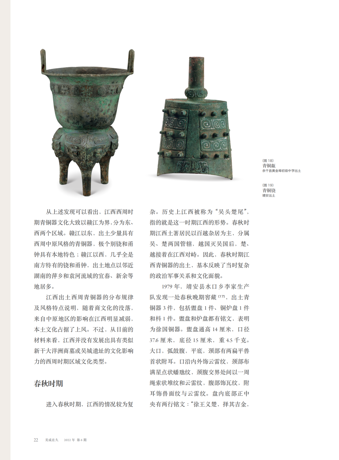▶ 江西东接闽浙,西连湘鄂,北及江淮、南达两广,是重要的文化交汇地带,孕育了独具特色的区域文化,在中华文明多元一体化进程中发挥着重要影响。江西先秦的青铜文明虽然出现时间不是最早的,但因域内拥有丰富的铜、锡资源,一经发端,便达到了令人瞩目的高度。在吸收中原青铜文化精华的同时,表现出强烈的地域特点,最终形成了自己的风格。