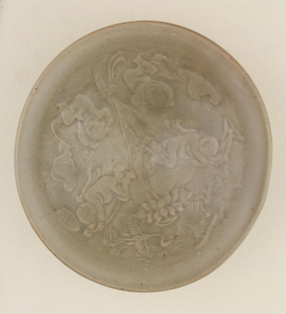 每天两分钟,赏雕塑,听艺术,大家好!今天给大家介绍,宋代文物,《耀州窑青釉印花童子玩莲纹碗》,高4.5厘米,口径14.3厘米,足径3.3厘米。