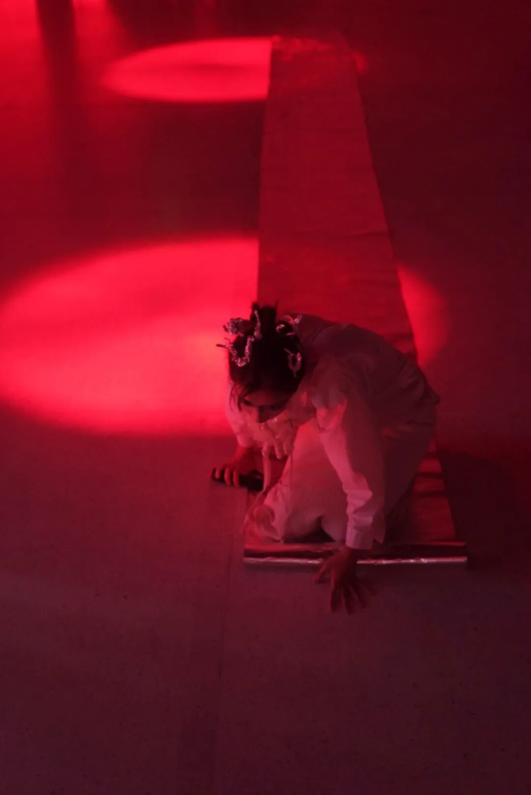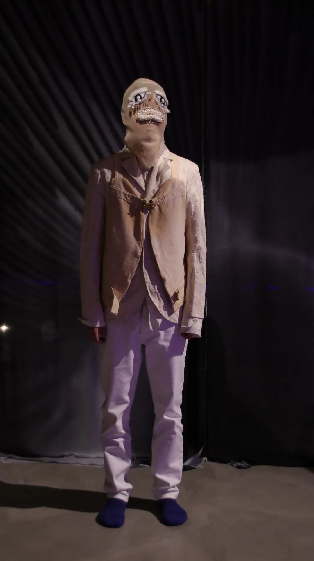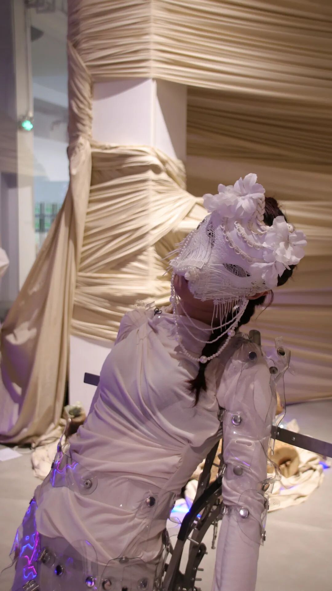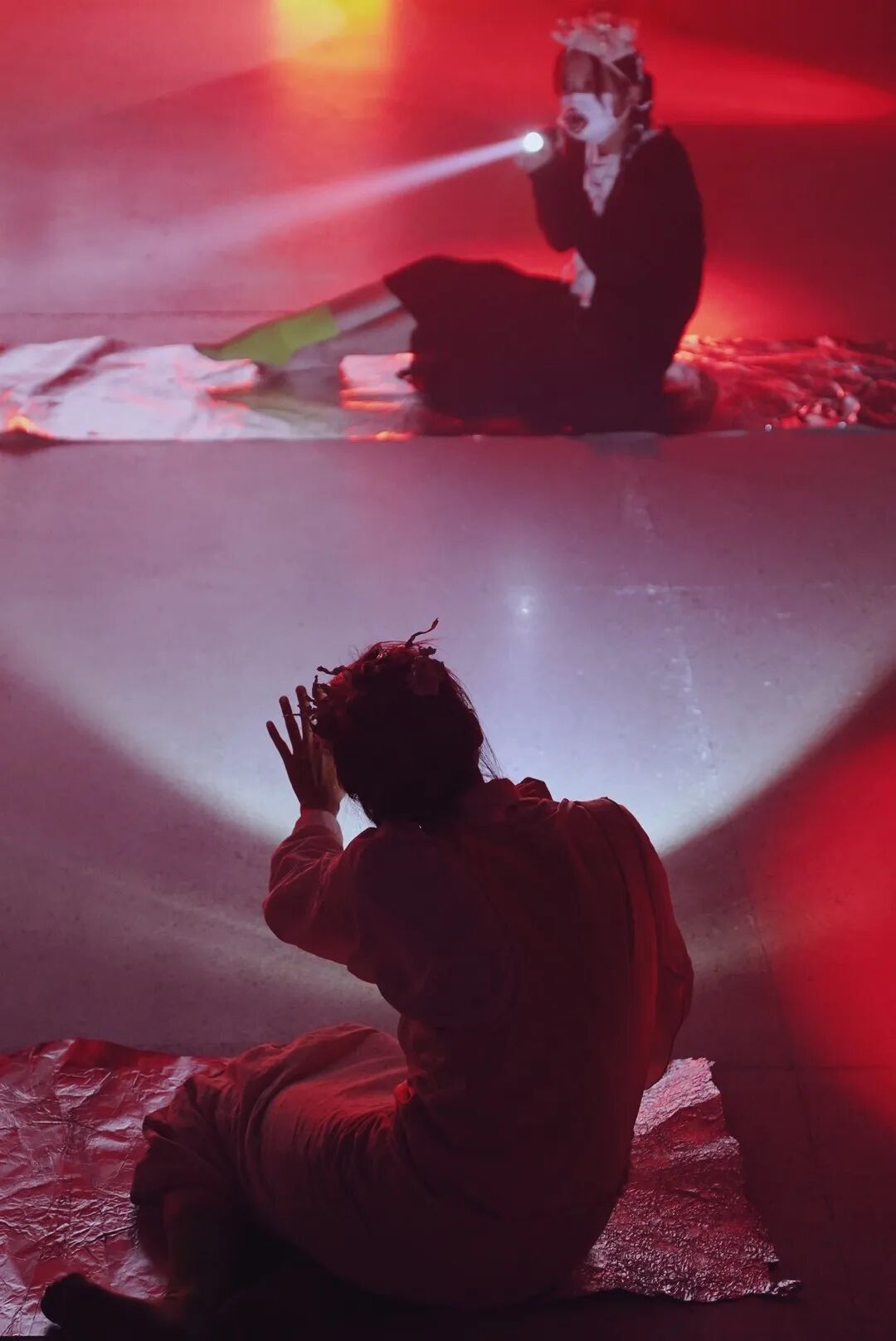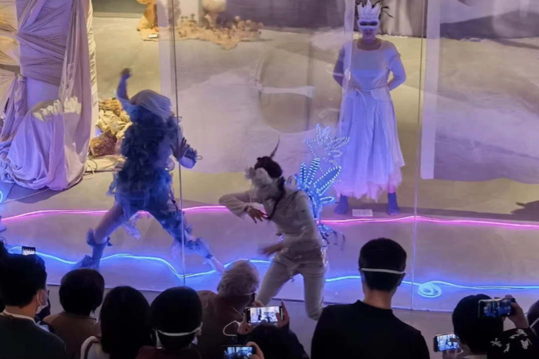 “我老说世界是假的,但世界是联通的,艺术家是不是也可以是一体的。我厌倦了以往在展览里像是额外'买一送一'的表演呈现方式,我想为我的肢体单独制造一个舞台。展览期间(2021.4.17)我们安排了一场表演,这是一场为这个空间里所有的作品而生表演,也是所有作品为表演而生的现场。通过'鸟人巢'、'狐嫁'、'鲸眠'、'船桅上'四个章节构成的'亚人表演'——因为我也不知道如何定义我的表演,既不是纯行为,也不是纯舞蹈的一种演出方式,甚至偶尔有那么点嘻哈——企图将时间、空间搅和在一起又切碎,把整个展览转换成表演的舞台,把所有人变成'亚人'。就像老赵写的台词那样:'没有什么礼物,只有风,只有空气在流动,没他们,也没有我,没有你。'”