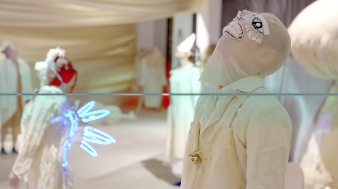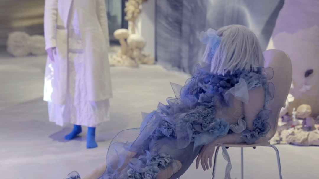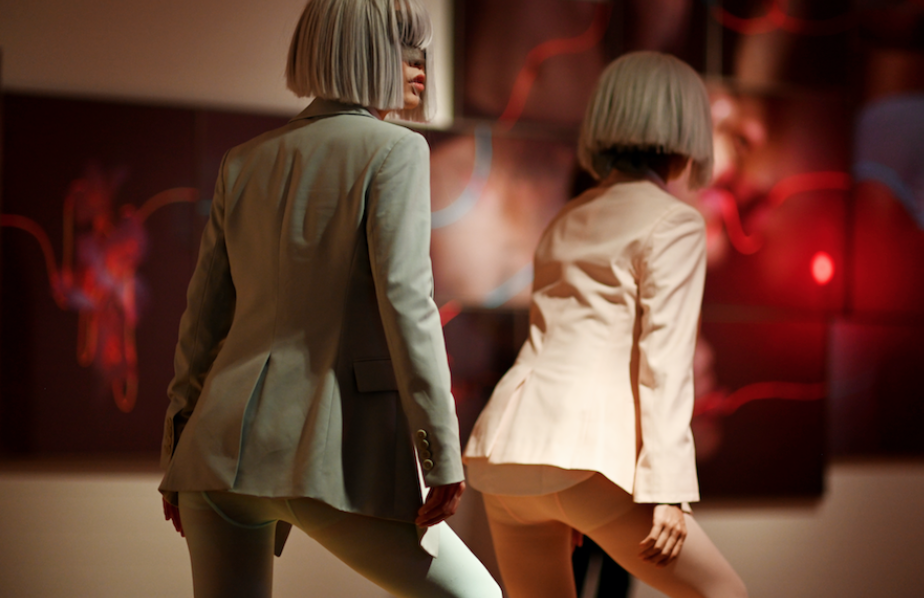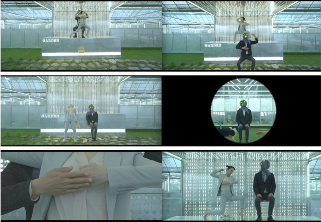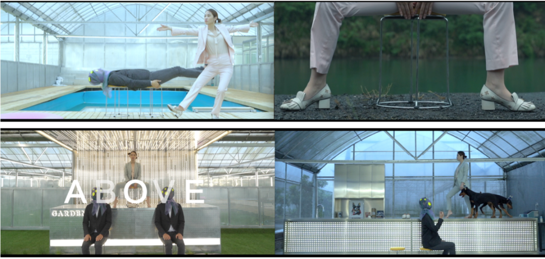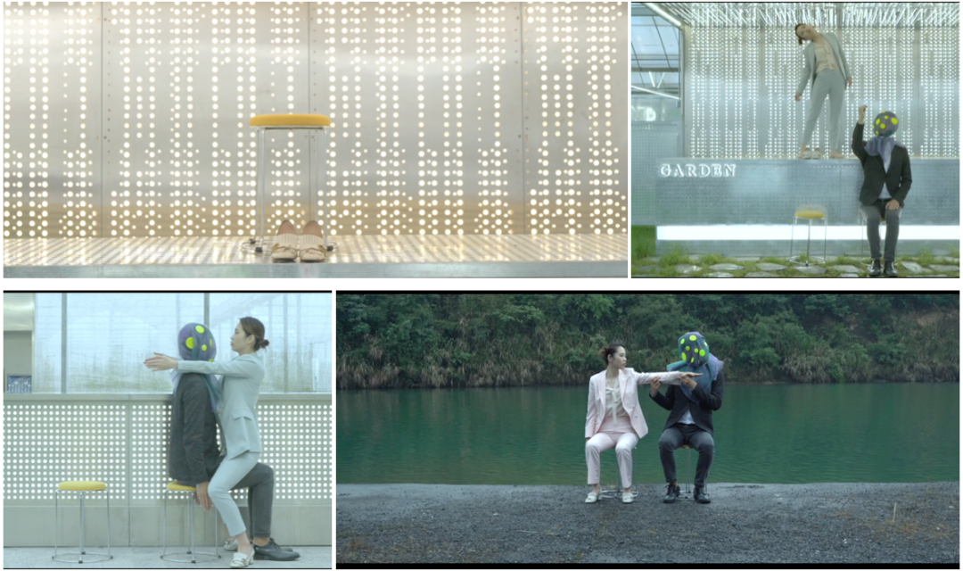 2019年作品《亚人系列1:之上》(Above)是艺术家一件非常重要的作品,这是她完整“亚人”系统的第一个系列作品,也是唯一一个“亚人”系列还未蒙上眼罩的作品。延续陶心琪一贯的肢体动作风格和疏离情感的表演,通过与非专业表演者共同呈现出另一种诡异的又不失协调的画景。男表演者在似懂非懂的复制中,呈现出一种自然发生的机械投射与试图自我表达的矛盾状态,使得整个表演不断出现沟通断点进而又创造出新的沟通方式。整个作品从构思到编排、拍摄、后期、音乐创作历时将近一年,是目前为止陶心琪最重要的非现场表演作品。
