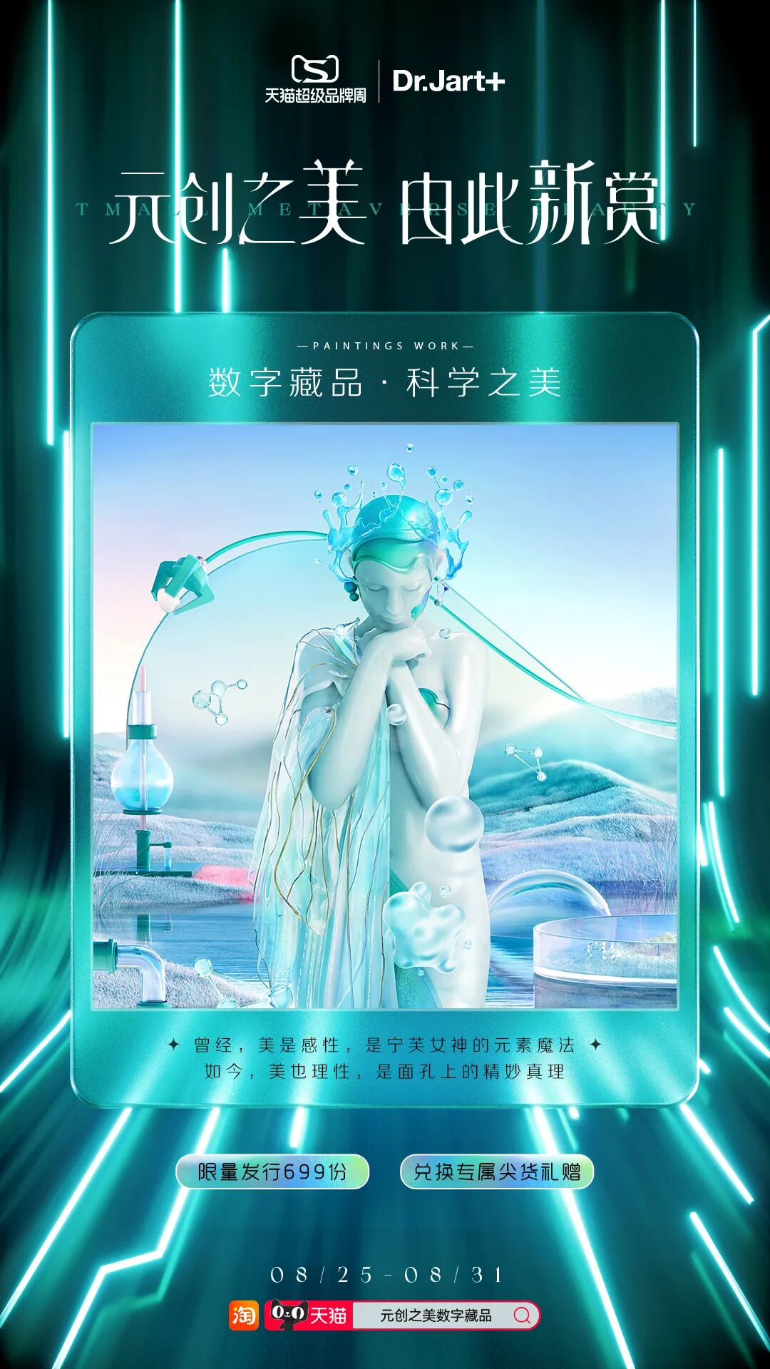 曾经,美是宁芙⼥神的元素魔法;如今,美是面庞上的精妙真理:置身玻尿酸⽔分⼦与矿物质构筑的唯美时空中,就连⼥神也为科学的美妙垂眸倾⼼——科学之美,来⾃天猫 X Dr. Jart+蒂佳婷的元创美。