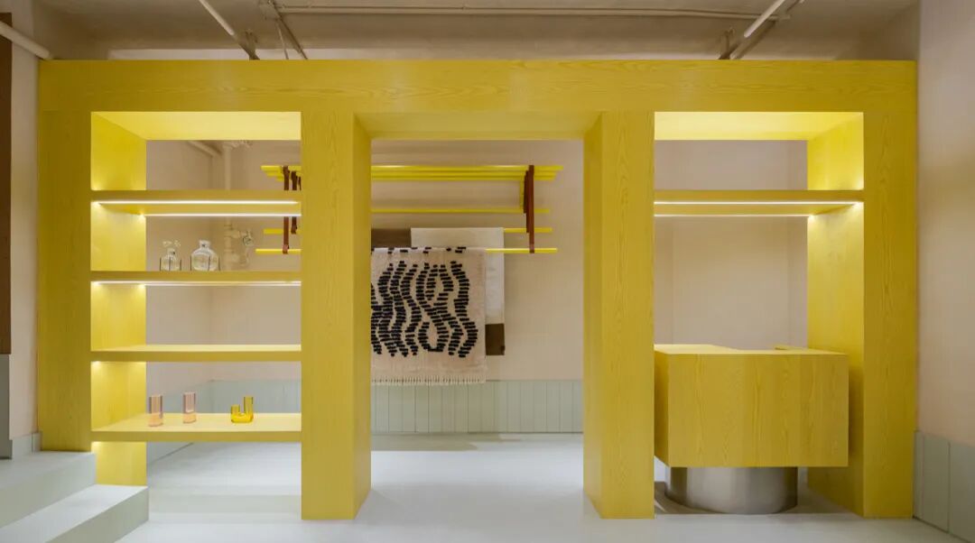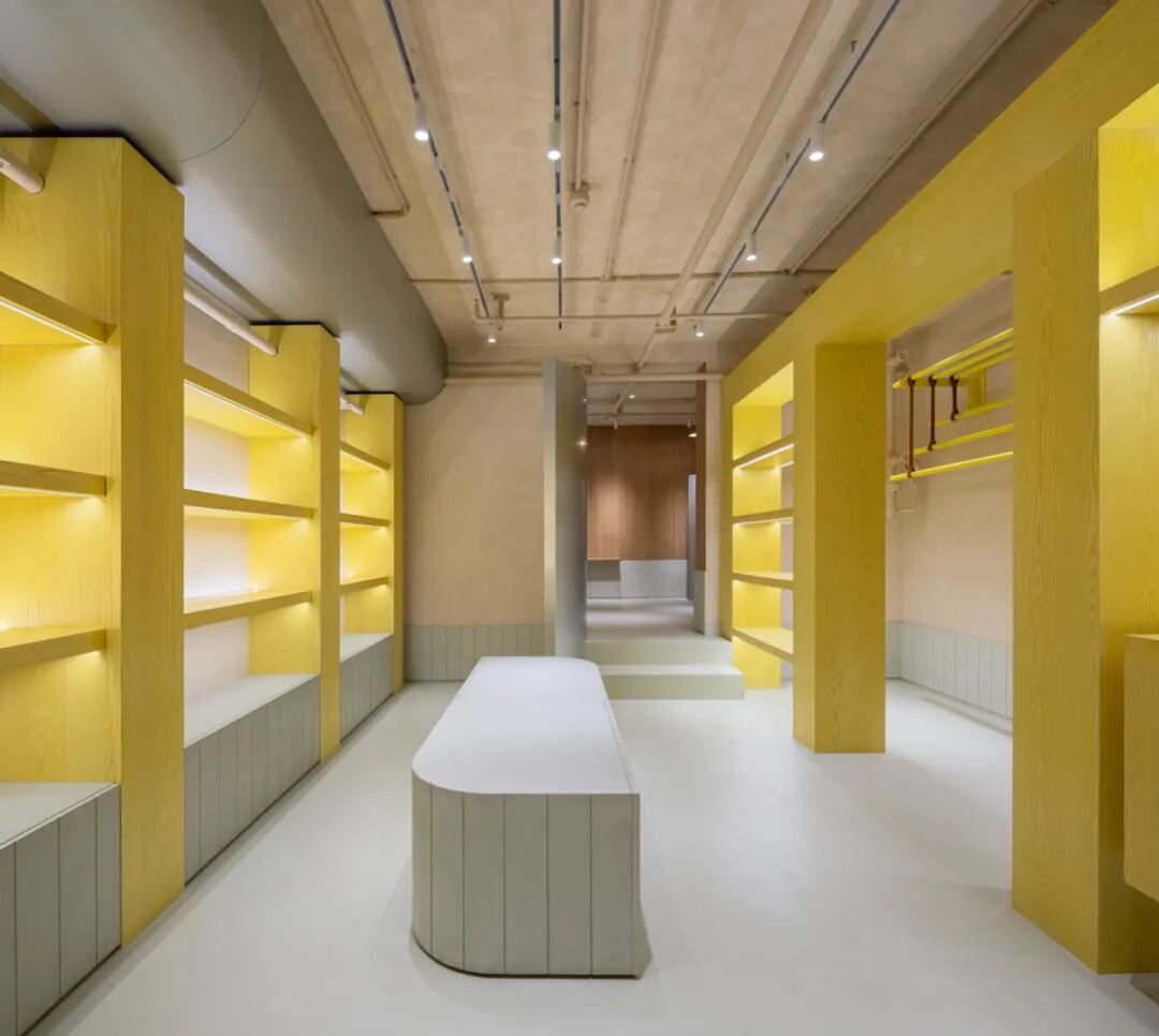 主空间内以一种吸睛的、明黄色手工染色木板作为主要材料,覆盖形成功能性的大量展示区,同时作为区分空间的结构组成。设计过程中,设计师希望空间语汇与展示设计充分融合契合,故将柱与梁的结构感带入,通过竖向类似柱体的结构与横向梁的结合,其间置入展示架、收银台等功能,让整体空间好似一件小巧的家具构造。
