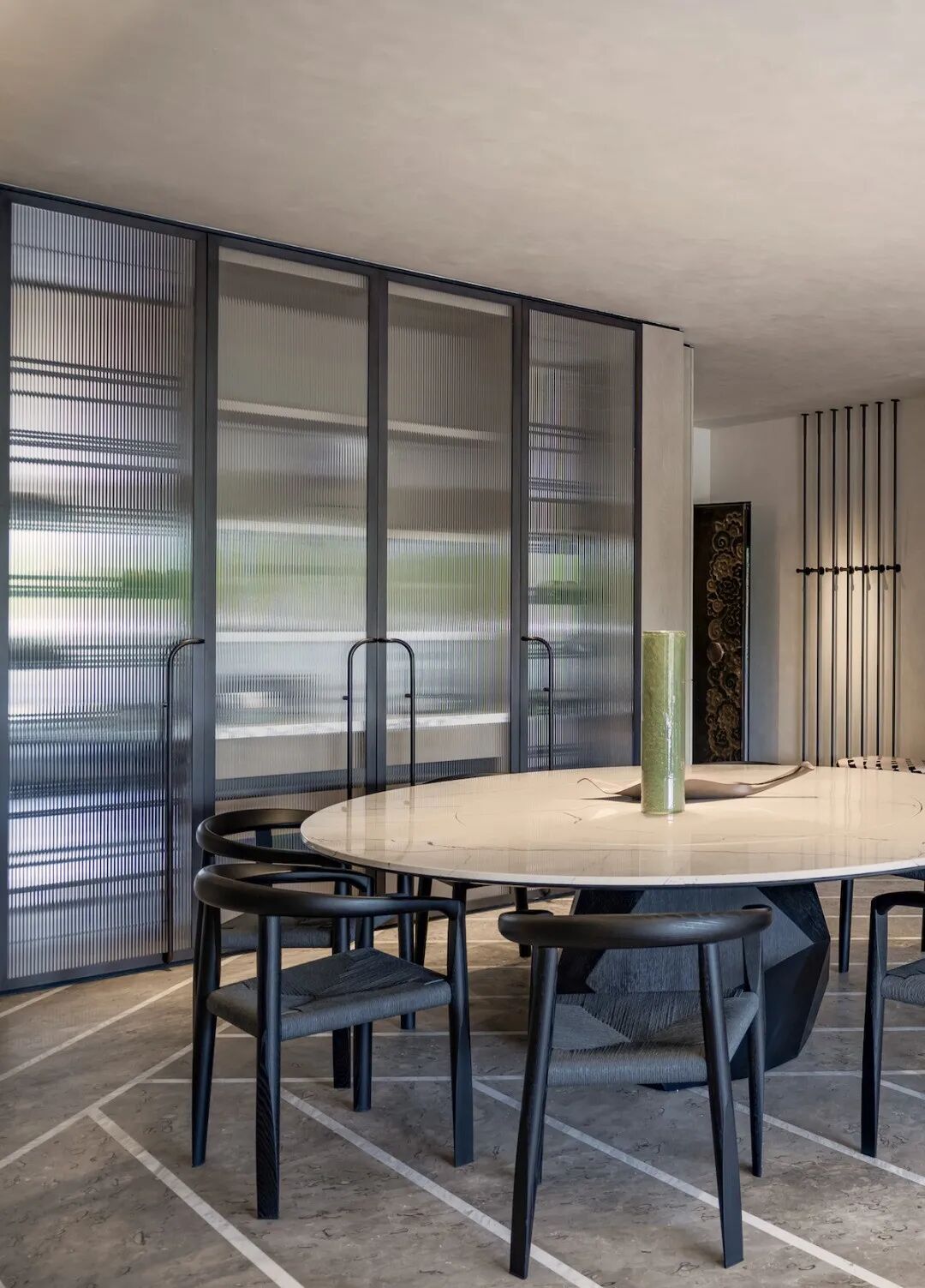 客餐厅|顶部灯饰采用隐匿的设计,让室外景观一览无余,光影流转,如水波般在顶部荡漾
