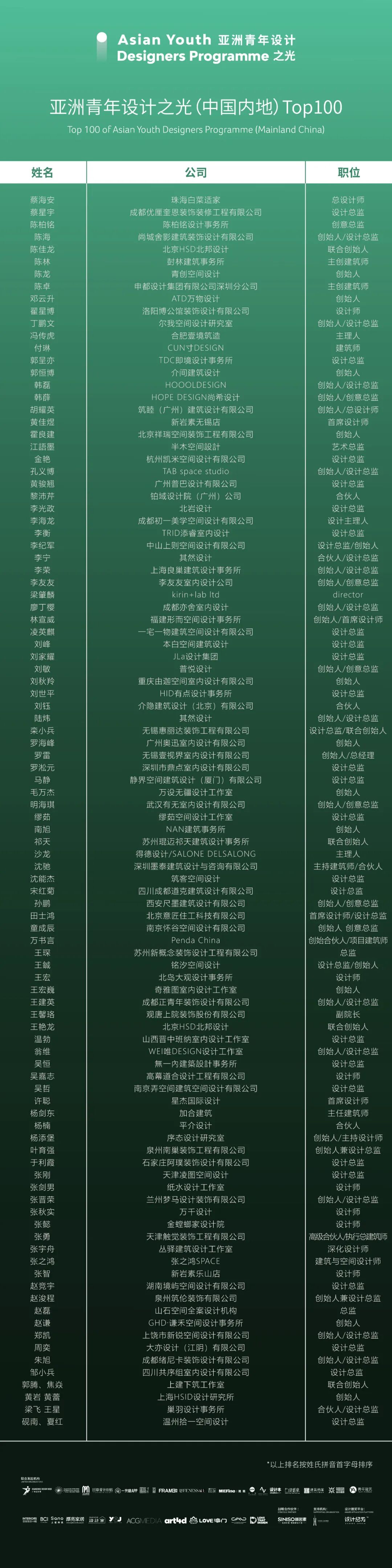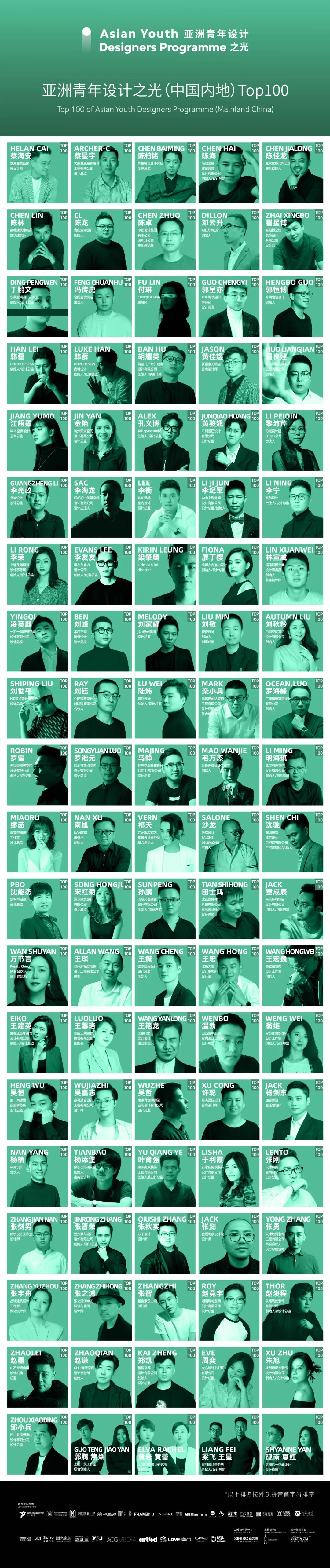 再次衷心祝贺以上来自中国内地的青年设计师们,荣登“2022亚洲青年设计之光(中国内地)Top100”榜单。同时进入2022亚洲青年设计之光(中国内地)Top100榜单的获奖设计师将获得角逐2022亚洲青年设计之光(中国内地)Top12的机会。