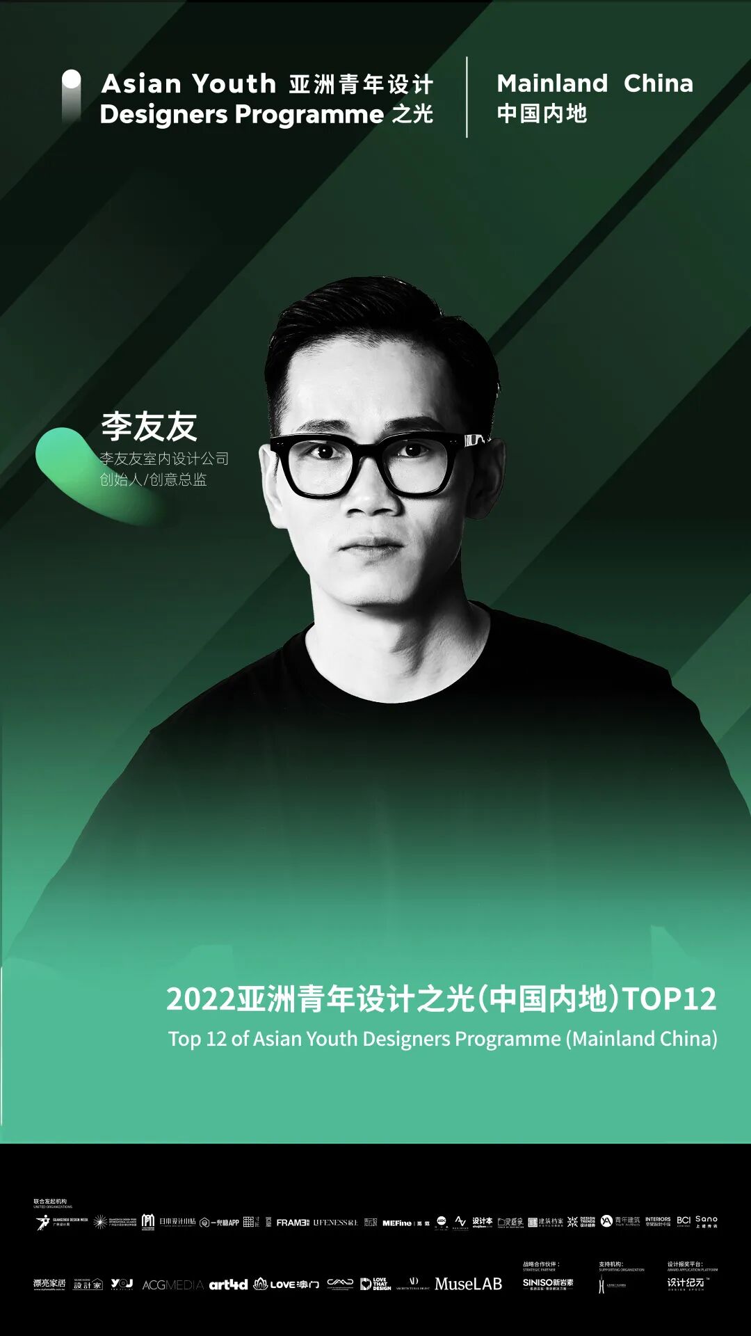 再次衷心祝贺李友友先生获得本年度“亚洲青年设计之光(中国内地)Top12”,并希望李友友先生在设计道路上步履不停,带领青年设计新力量,站上国际的舞台,传递亚洲青年设计价值观。