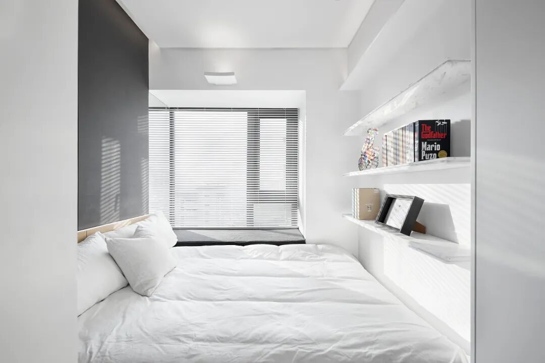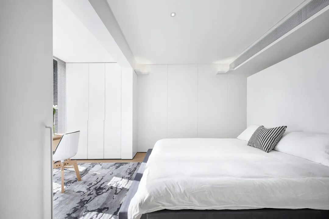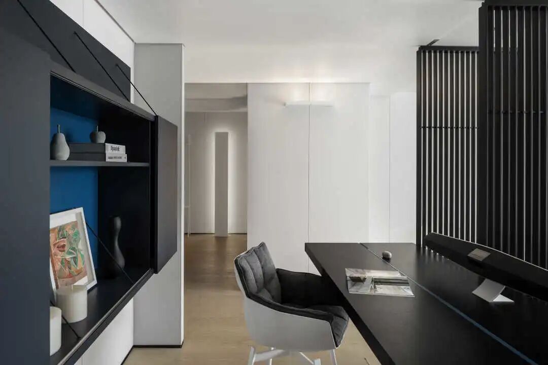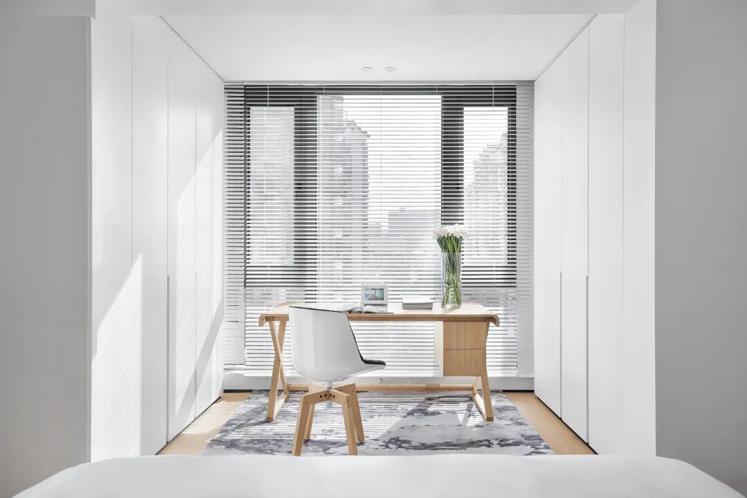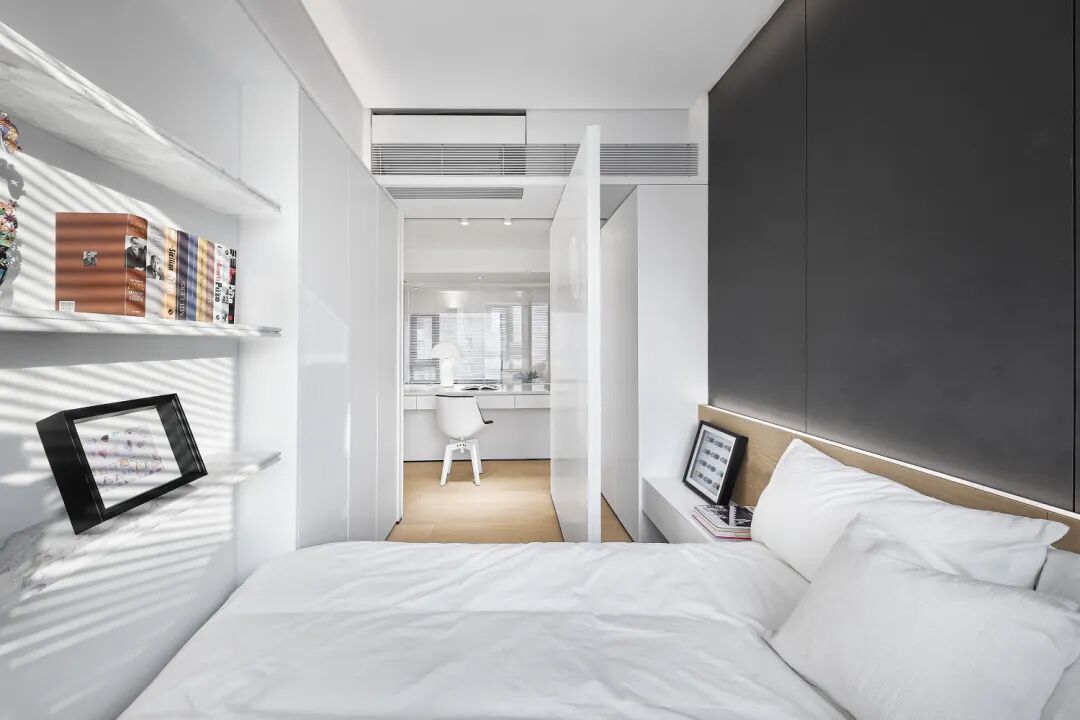 可转动的屏风,使得后面的书桌与卧室融为一体,扩展整体空间,又做到工作、休息互不干扰。两边的风格与色调和谐统一,不显得突兀,既能沉思又能沉睡。