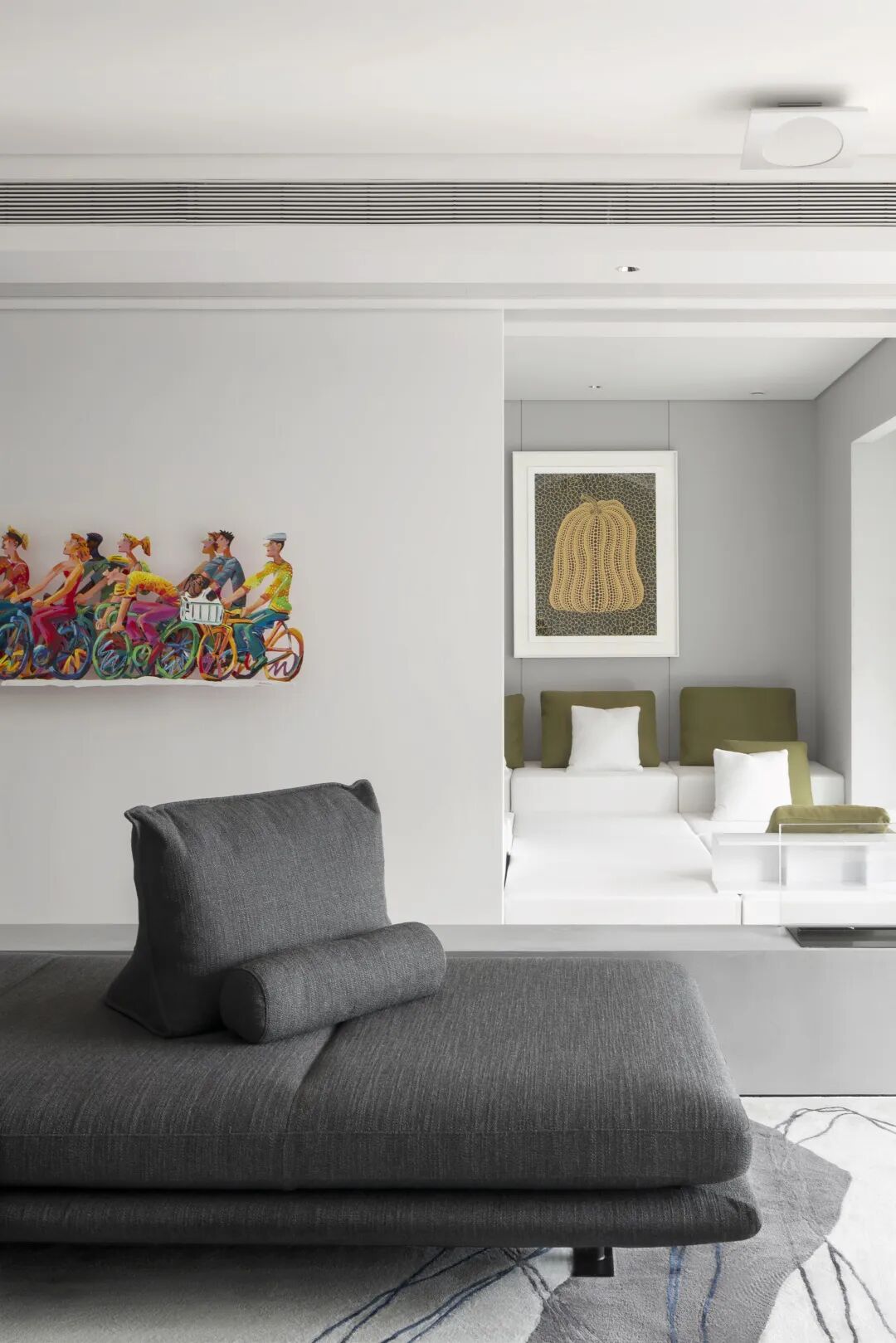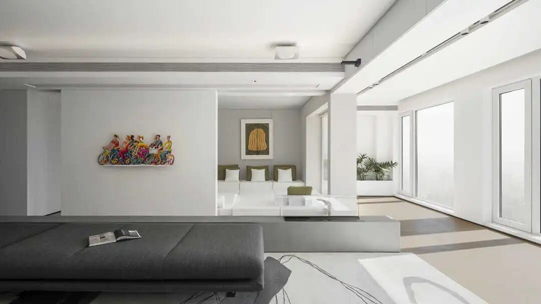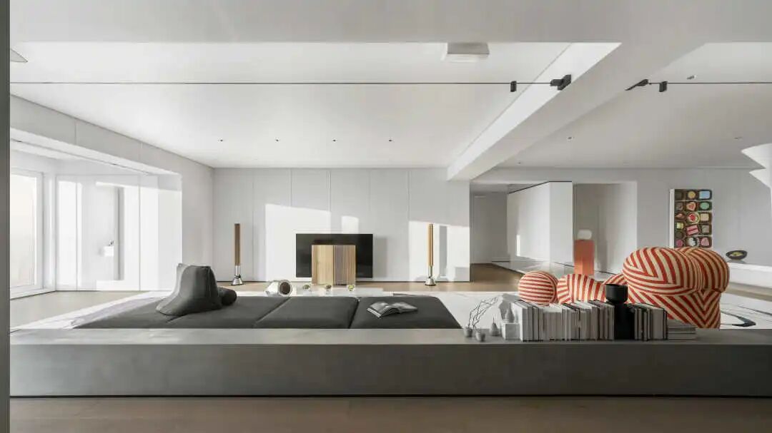 客厅与多功能室之间的关系是本次设计的亮点与创新之处,它真正突出了一室多用,灵活自如的现代简约理念。