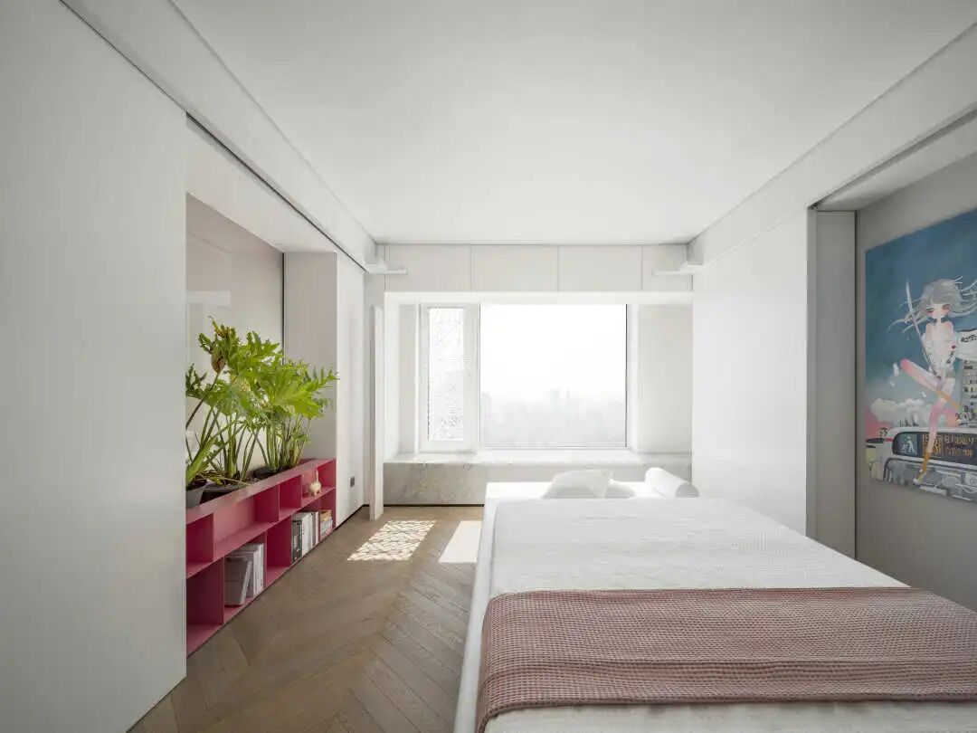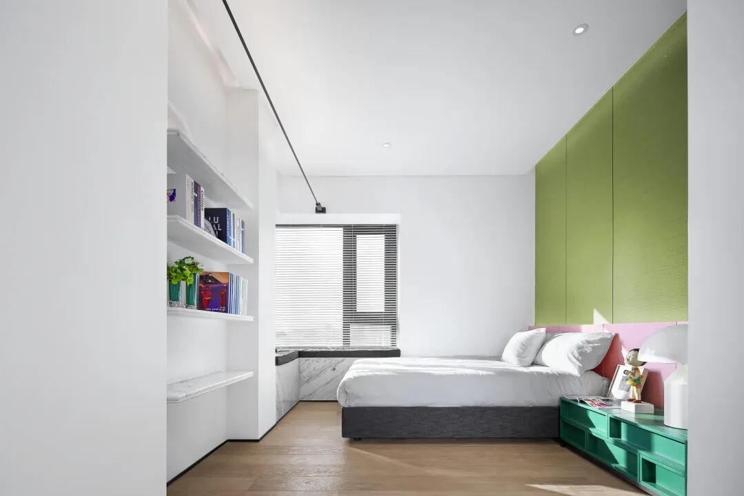 书架上的彩色色块点缀着这片属于孩子们的“地盘”,接地气的榻榻米设计为孩子玩闹、阅读提供了柔软的体验与安全保障,关上推拉门,两个空间的光线透过玻璃相互交织,完美调节、平衡了室内空间、光线、声音多种元素。