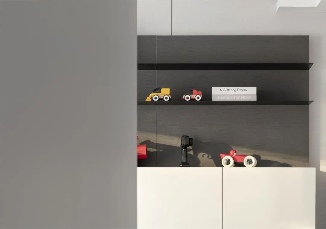 空间布局的色调以灰白元素为主,其中融入一些明亮色彩的家居和饰品,提升房间生活气息与生机活力,平衡了极简的主题内涵与居家的温馨感受,在有限的空间中,创造了一家人日常互动交流,其乐融融的生活气息。