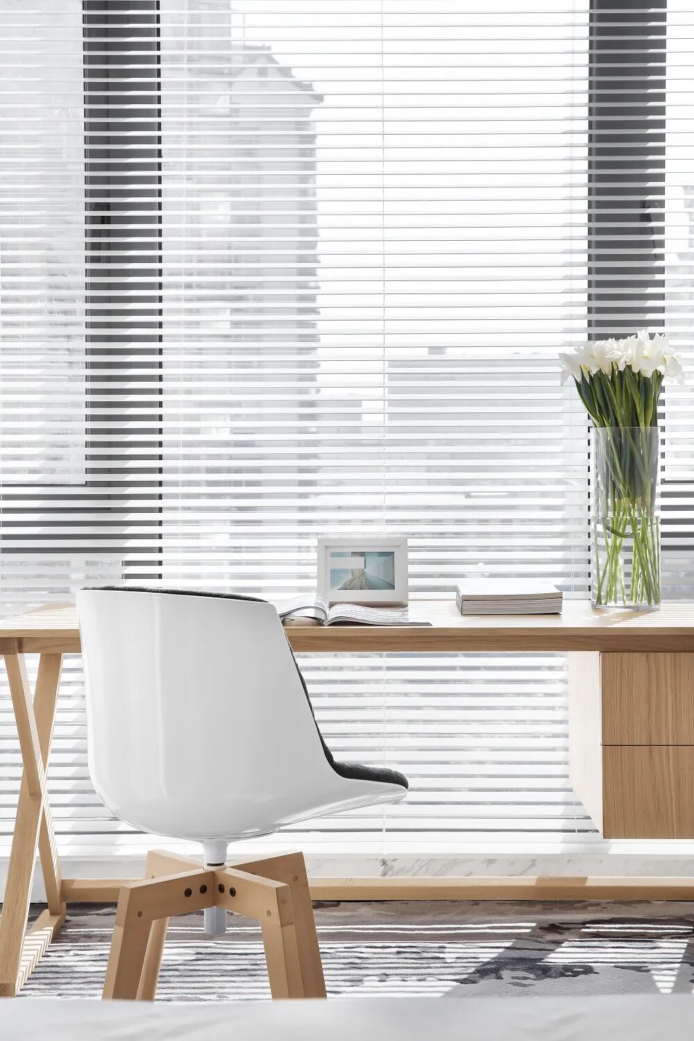 书桌前的玻璃也很有考究,可以在透明和非透明之间自由切换,实用的同时保障了私密性。