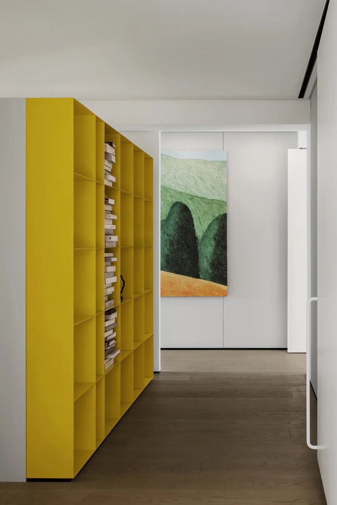 黄色柜体与山川油画是青春的外化,这个为孩子量身订做的收纳空间,让孩子从小养成自律的品格和良好的卫生习惯,培养他们亲自规划、设计自己的生活。