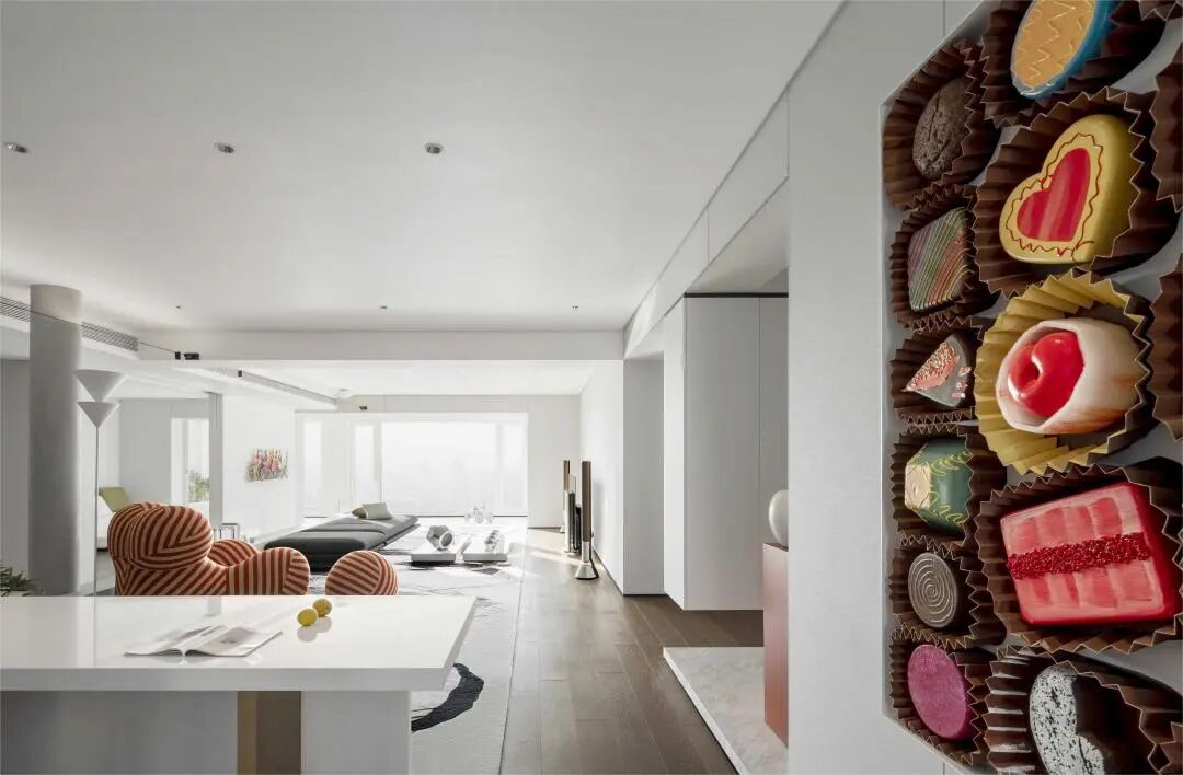 餐厅望向客厅,仿佛空间又增加了几倍,墙上的点心装饰活泼耐看,让人食欲倍增。
