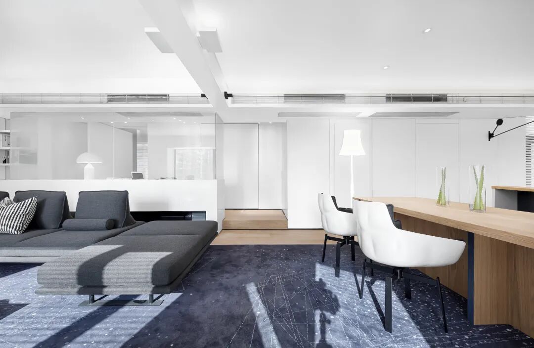 除了沙发的朝向及款式经过特别设计以外,设计师将一张繁星璀璨的图片定制成通长的地毯,一直延伸至吧台,特意选择厚度较大的深蓝色的地毯,赤脚踩踏的感觉尤其舒适。