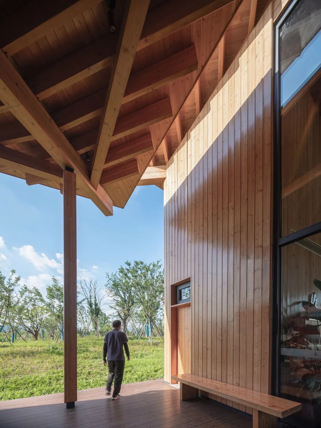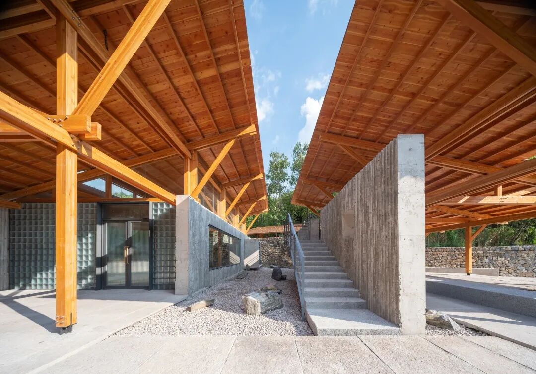 木结构柱网体系与墙体之间形成三种不同内外交接关系:接待中心木结构柱网全部在墙体内侧,公厕的屋顶木结构柱子则全部裸露在墙体外侧,开放公共空间屋顶则是与墙体同一轴线,咬合在一起。