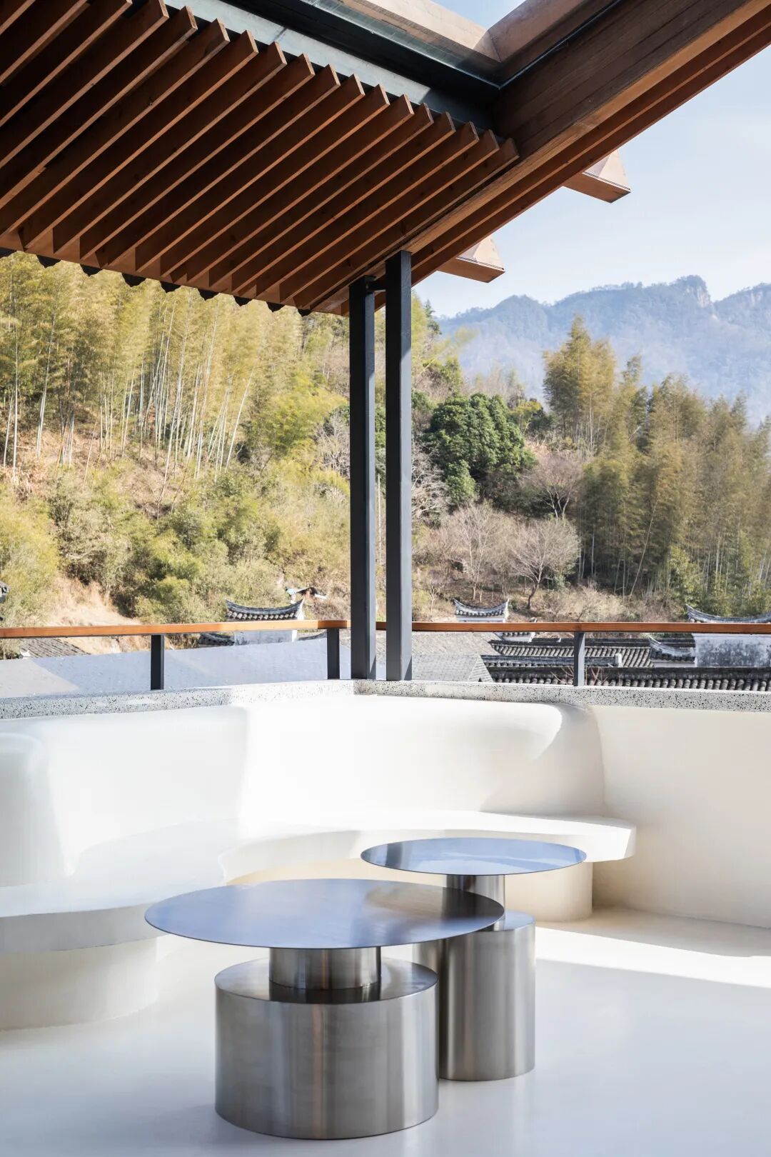 远山作为关键要素,在空间中希望被以不同的方式观看感受:在建筑的下部分空间,山体是隐隐约约在树干间透出来,越往上行走,视野开阔的同时,连续的山屏也逐渐展现。