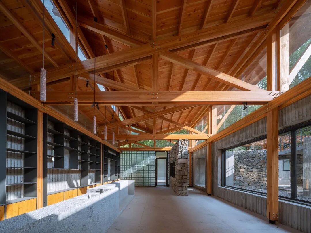 建筑二层的外立面是通透的木框玻璃界面,结构和立面体系分离,门架式的钢结构体系内退,落在一层的梁上。屋顶上钢木结构混合搭接,实现钢结构与木结构的融合与转换。