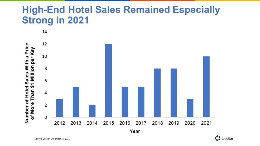 这些交易表明投资者对高端酒店的信心。根据STR的数据显示,截至2021年10月,豪华类酒店的入住率只有51%左右,比2019年低28%。但其平均房价是337美元,比2019年高出11.5%。所以,即使一半的房间仍然空荡荡,酒店运营者还是把握着定价权。因此,不难预测的是,2022年酒店资产交易的活力会更强,而高端物业交易则是拉动增长的重要支点。