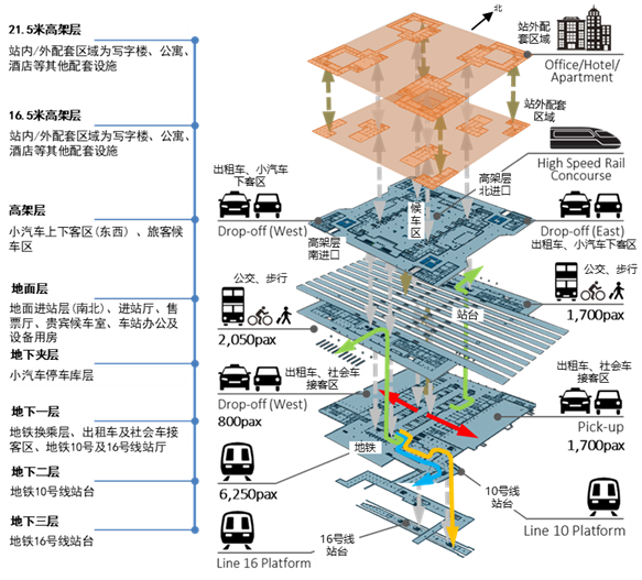 各层功能布局包括:地铁16号线、地铁10号线、换乘层、出租车及社会车接客区、小汽车停车库、旅客地面集散区、公交车场、小汽车高架落客区、旅客候车区和站内外配套区域,如写字楼、公寓、酒店等。