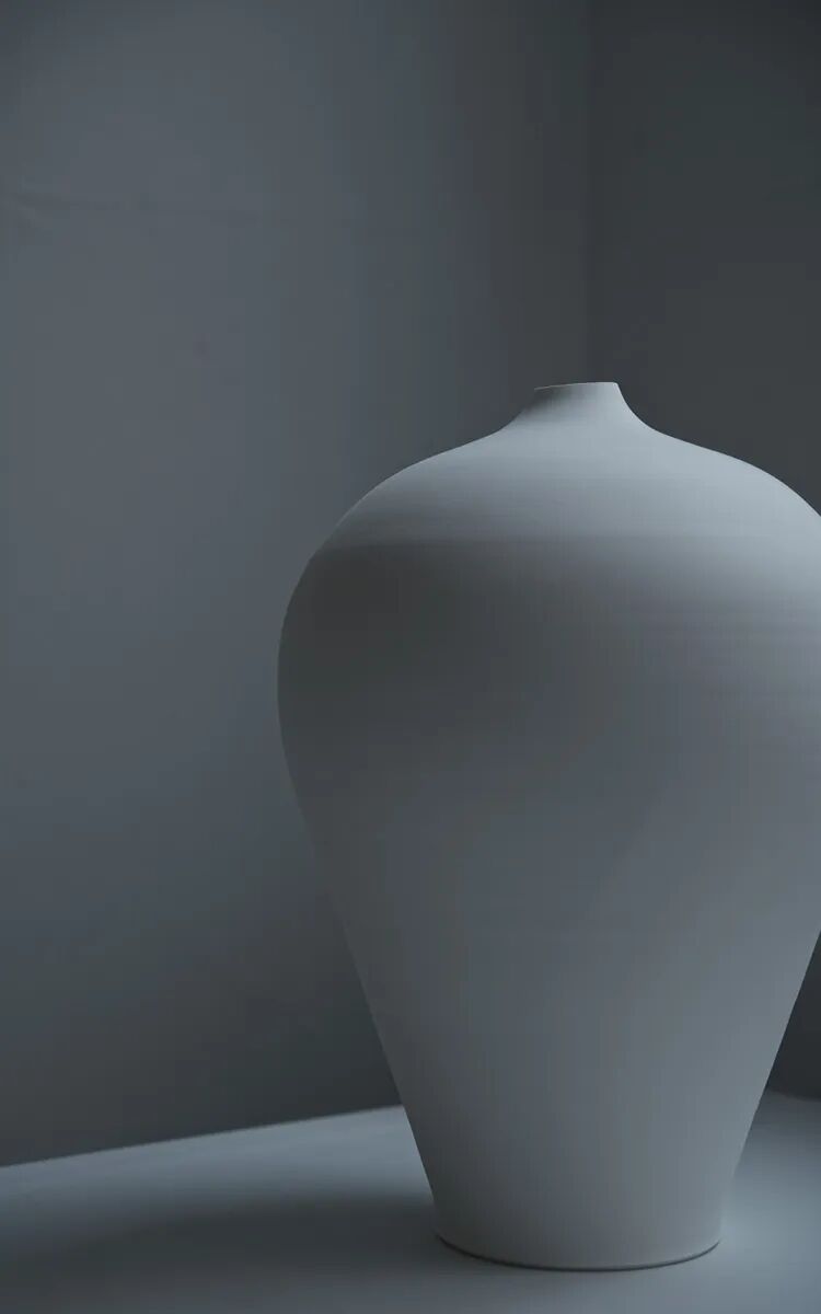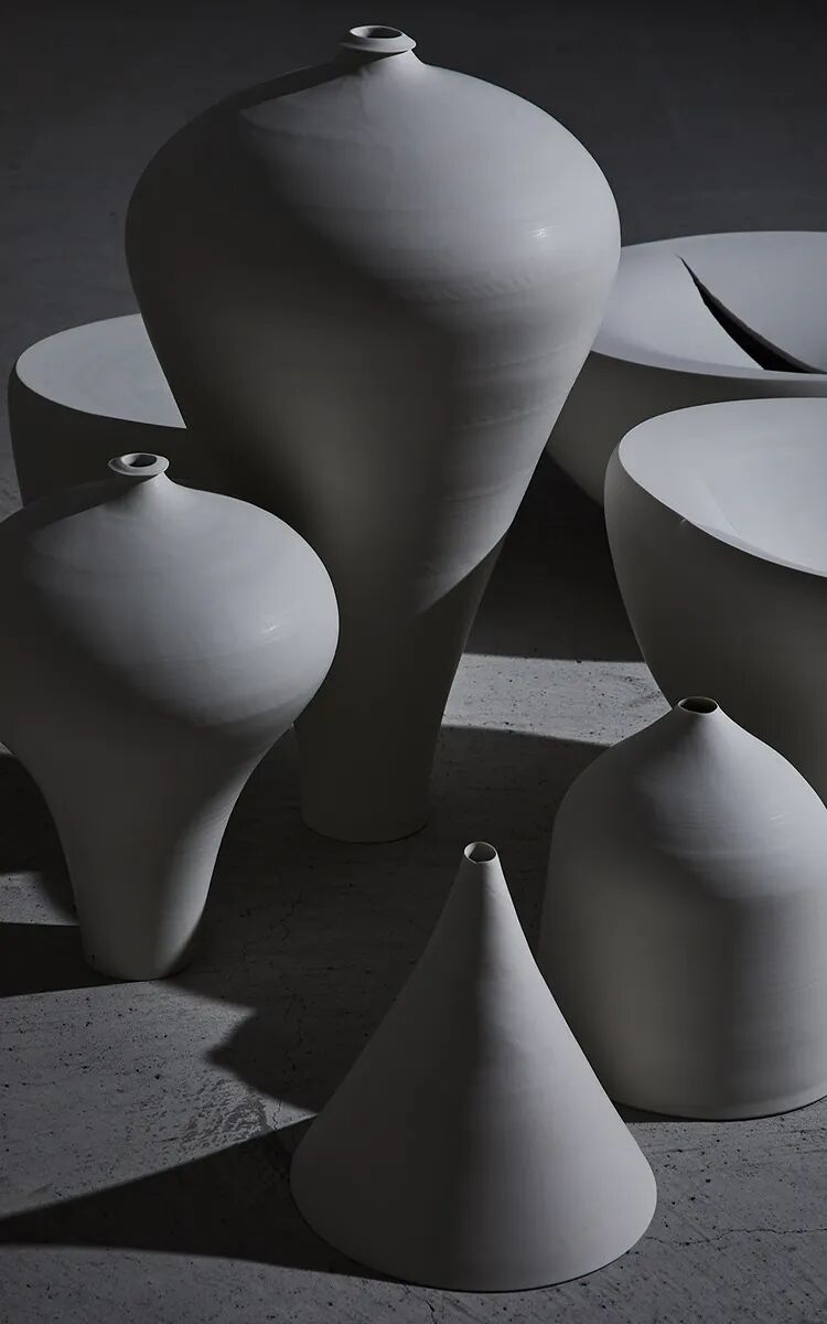 黑田泰藏的白瓷以表现独特宇宙观的简洁造型为特征而闻名世界。其造型从碗、壶、盘等传统陶器的形态出发,彻底摈弃装饰,追求物质存在的永恒性。他通过把控白瓷内部的空洞和外部的物质性之间的关系,使得最终的造型似乎在“存在和不存在”之间达到完美平衡 —— 物质与精神,理性与感性,虚无与现实的平衡。在他的白瓷中,可以感受到宁静与永恒的独特世界。