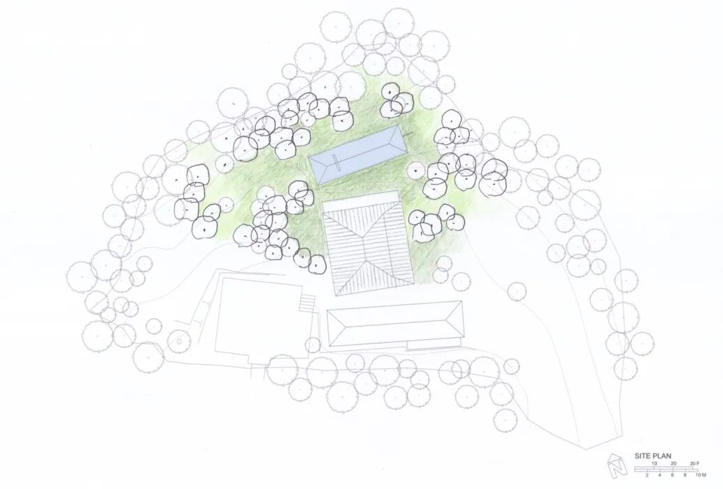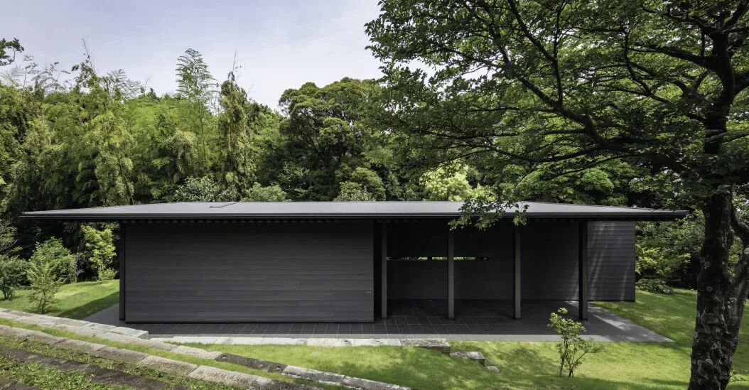 基地位于伊豆半岛东部的伊东市,一座可以远眺相模湾的小山丘上。1981年,35岁的黑田为了建立自己的工作室,搬到了伊东。在海岸悬崖边约6600m²的广阔用地上,他的家和工作室安静地伫立在这个被森林包围的角落里。现有的建筑皆由黑田先生亲手设计打造,深檐斜顶下是极致简洁的空间,除了必要的空间隔断,再无任何冗余的修饰,室内外与手直接接触的物件都选择了天然材料,建筑在物质与感性层面都深刻融入自然。庭院内的树木、石头、浮着莲花的水盆,以入画的布局既各自成章又和谐统一。