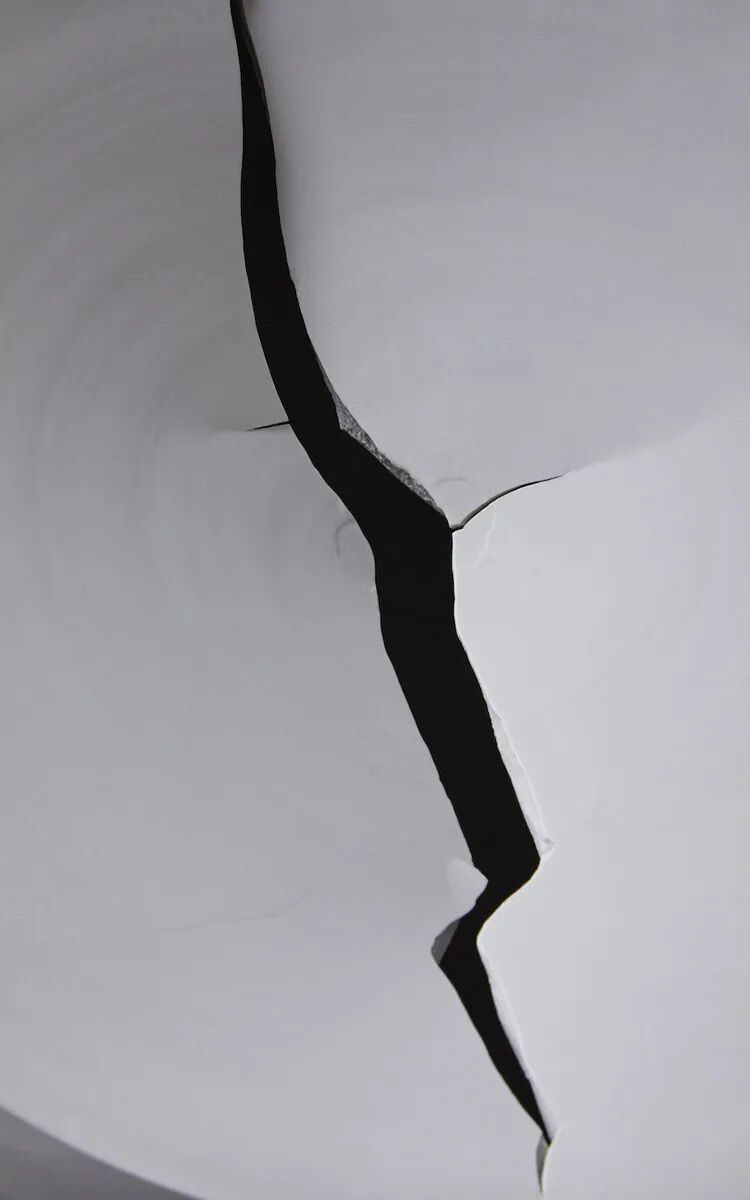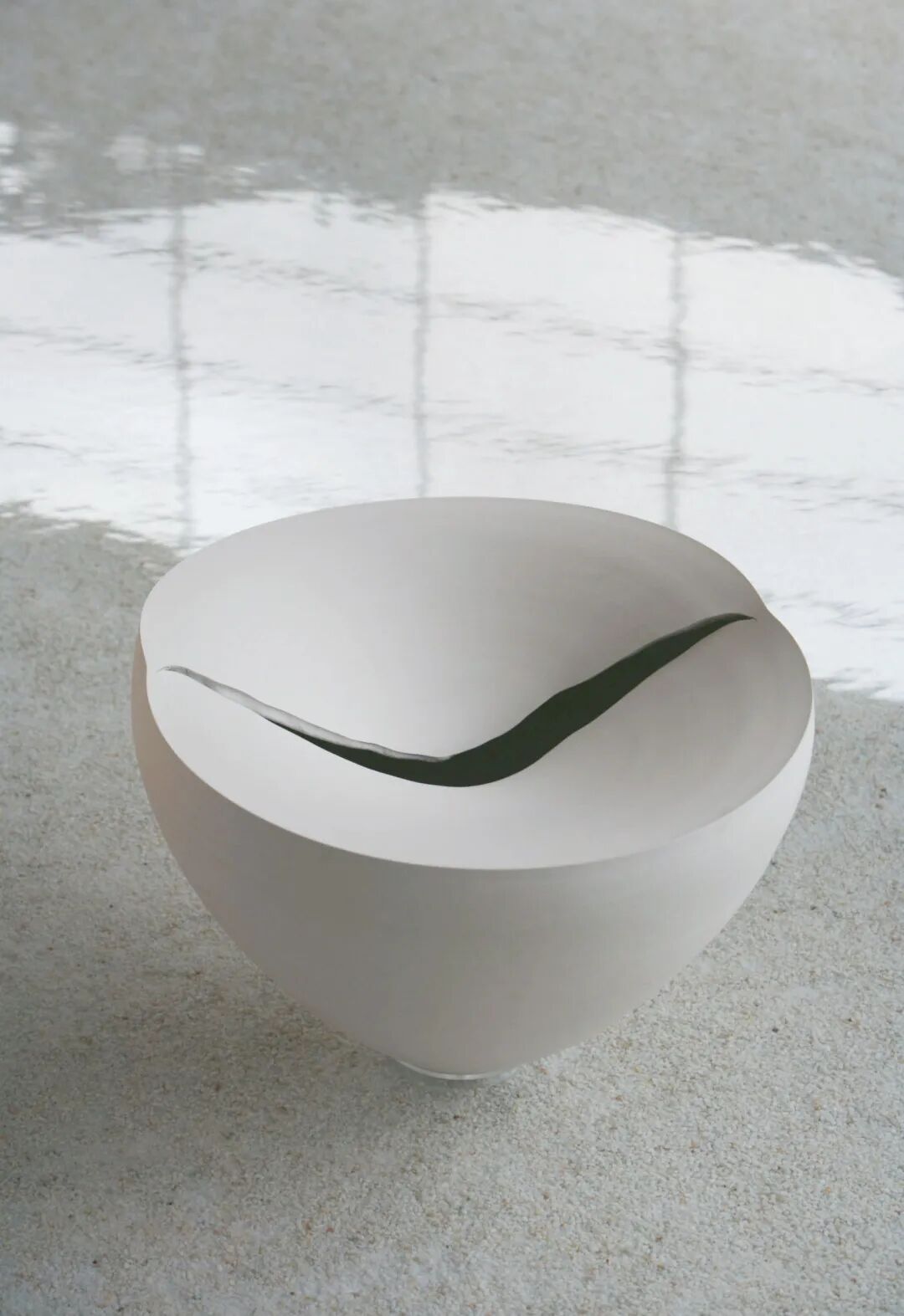进入建筑物内部的一刻,景色瞬间改变,房间尽头的缝隙射进一束白光,黑田泰藏雕塑般的白瓷作品犹如漂浮在水面上。光凝聚在白瓷表面,白瓷的影子又倒置于水中,二者的真实性变得模糊,时间凝固在现实与虚幻的交界点。一阵风袭来,水声潺潺,涟漪渐起,倒影婆娑。白瓷的张力在空间中得以完美呈现。