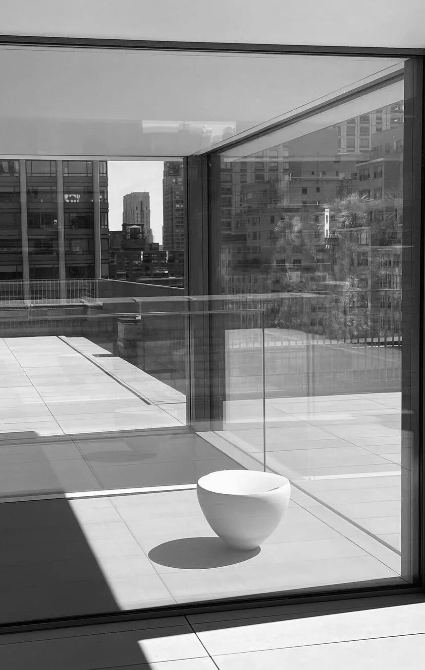 上:安藤忠雄设计的“曼哈顿屋顶小楼”内,黑田的白瓷与安藤建筑的“偶遇” ;下:吉井画廊(纽约)内安藤设计的幕墙与黑田的白瓷