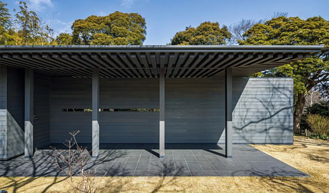 由安藤忠雄设计打造的展示空间,与黑田先生的家并列而置,实际建成后的占地面积仅17.3m²。与住宅及工作室建筑相呼应的深檐屋顶由所需的最小限度的结构支撑,其下约一半是室外空间,是名副其实“缘侧”一般的画廊。