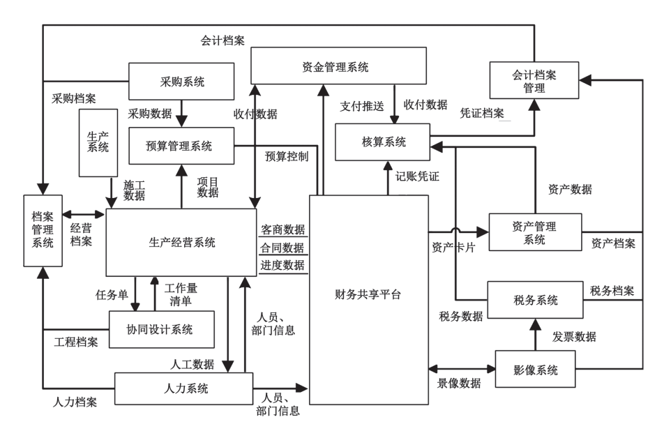如图2所示,通过“三步走”模型,将预算管理、设计管理、资金管理、费用核算、生产经营等系统进行对接,配合其他相应的管理模块如人力资源系统、档案系统等,将EPC项目数据、预算数据、税务数据、收付款数据、费用报销数据、人工成本数据有效的整合在一起,消灭信息孤岛,为业财融合奠定基础。
