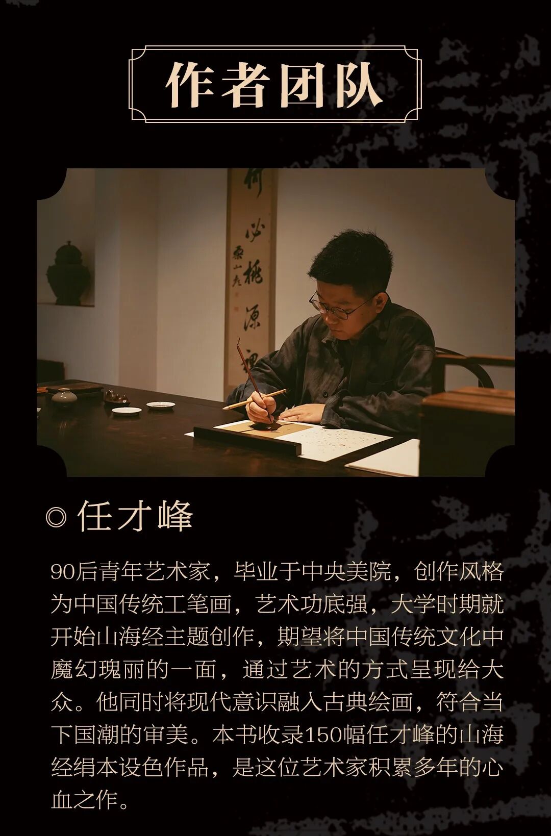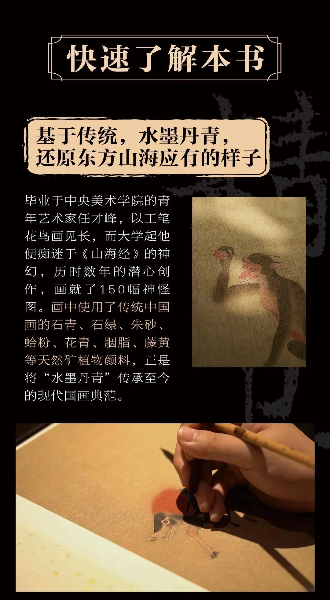 本书收录150幅任才峰的山海经绢本设色作品,选取山海经中比较经典的形象,按文本顺序,均匀排列。绘画作者任才峰是90后青年艺术家,创作风格为中国传统工笔画,期望将中国传统文化中魔幻瑰丽的一面,通过艺术的方式呈现给大众。