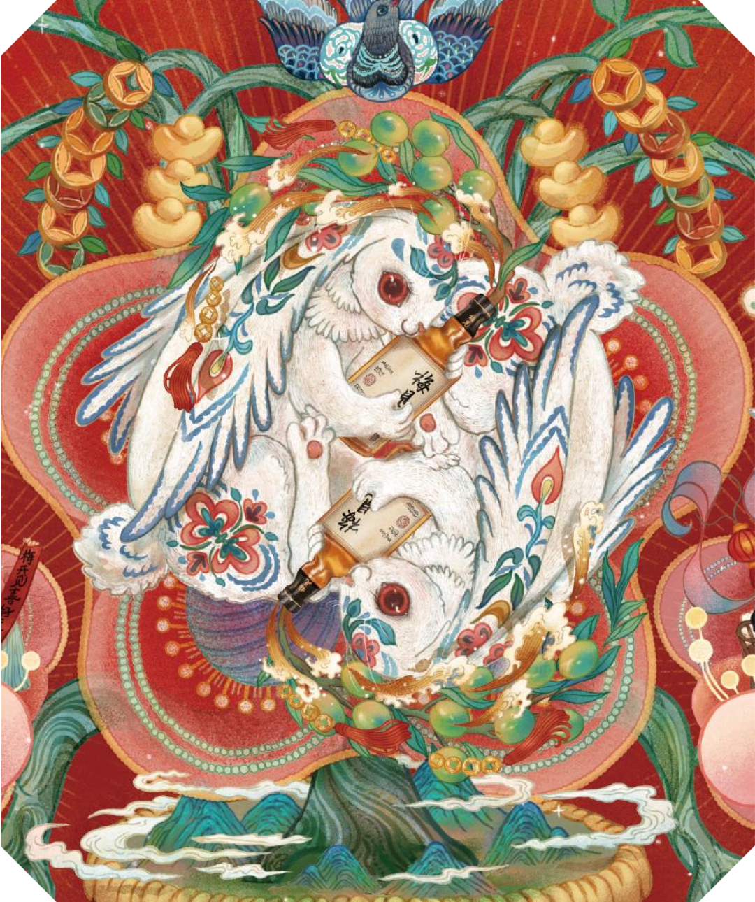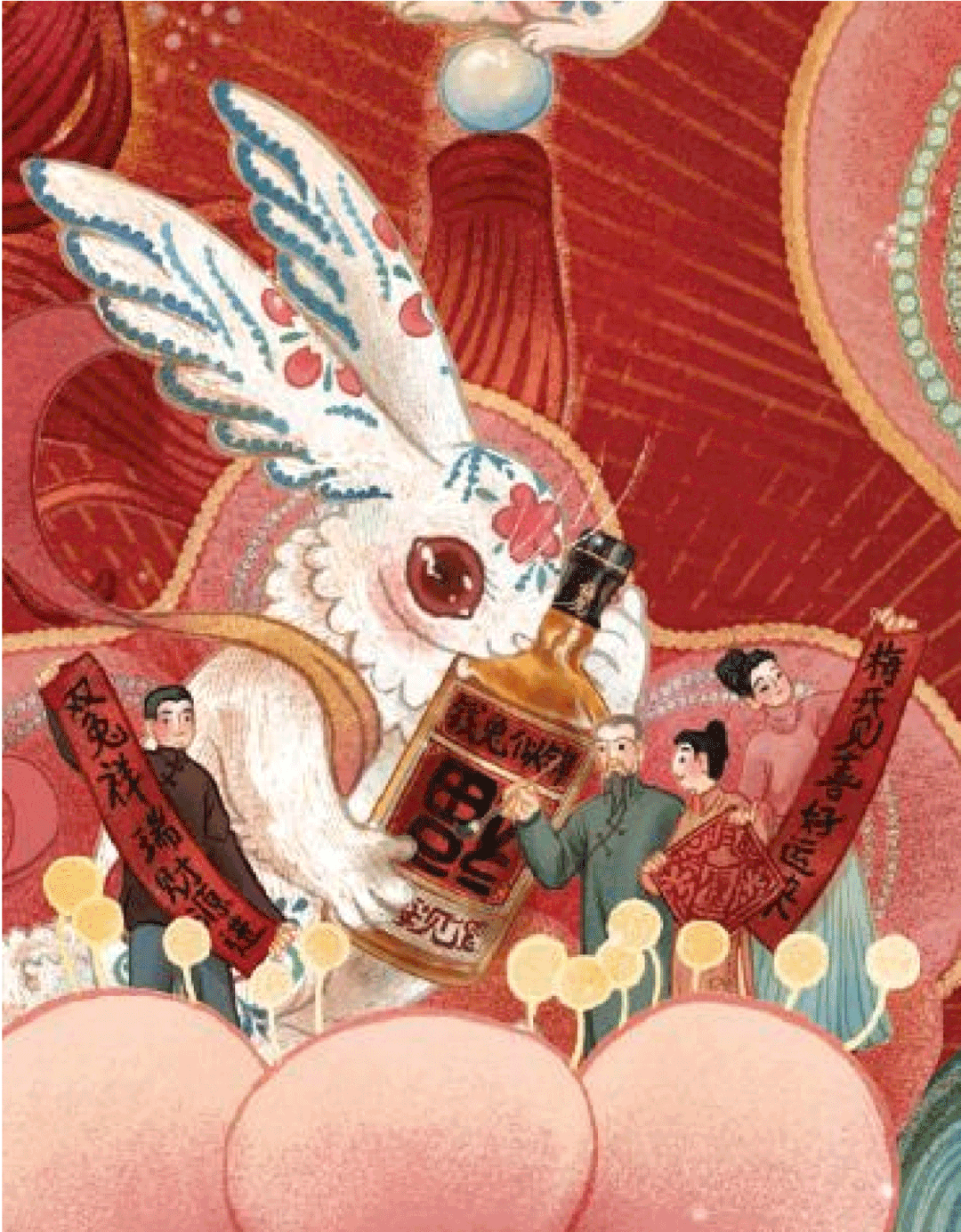 在传统文化中,兔是通天使者和幸运之神,被古人视为吉瑞之物。作品中处于视觉中心的两只玉兔抱着梅见呈太极形状,他们在聚宝盆样式之上盘旋,象征着花开富贵、财源广进、前途似锦。兔傍喜鹊, 配以放鞭炮、贴对联、团圆饭等主题体现新年美好祥和的气氛。