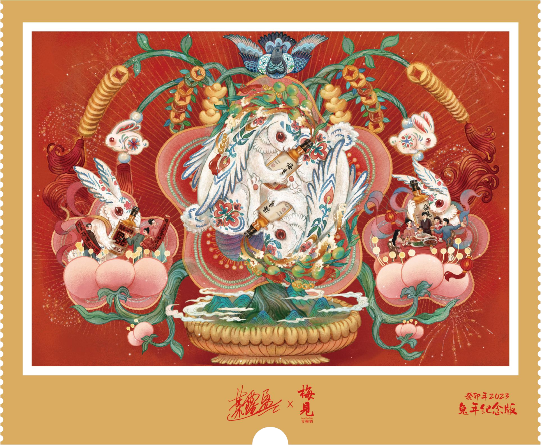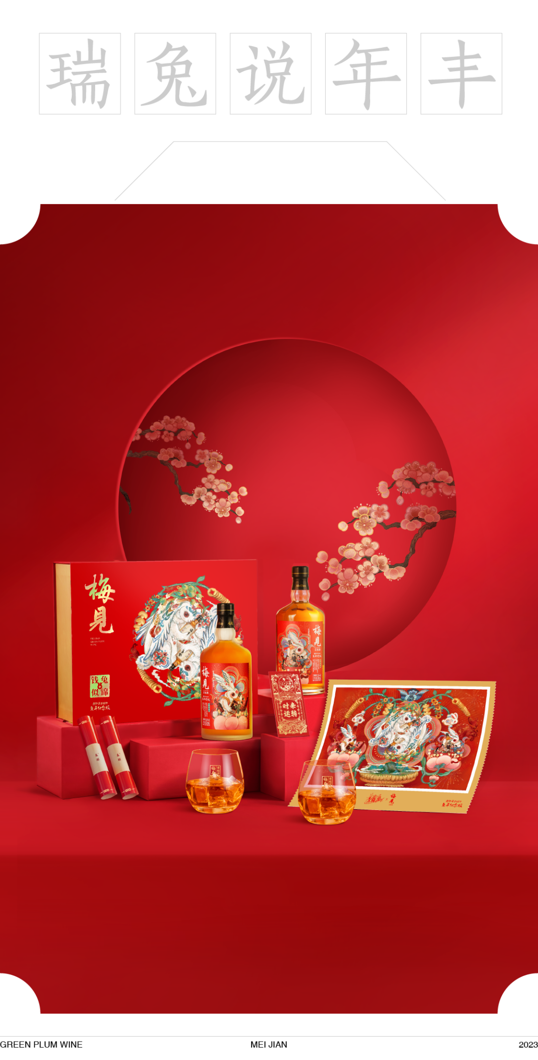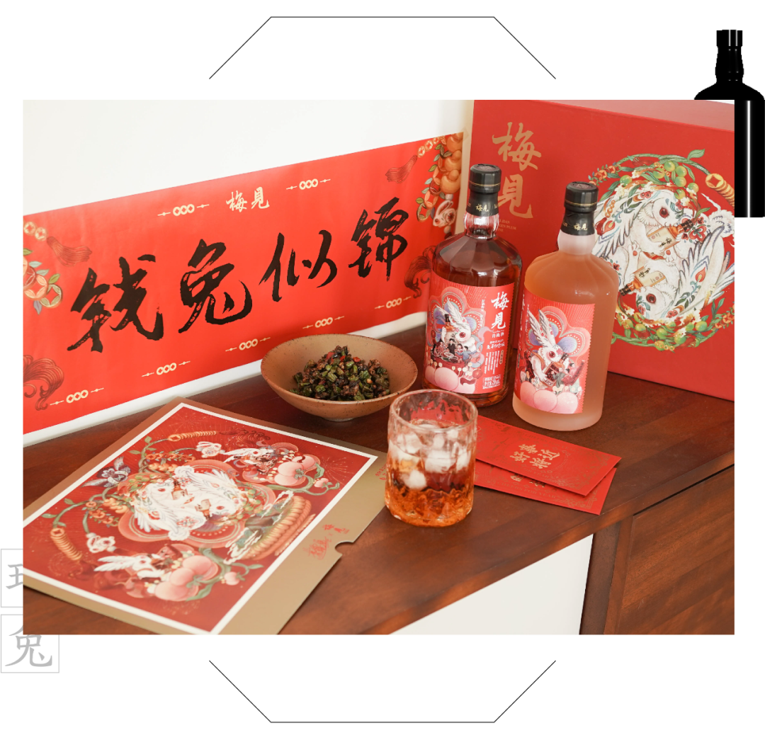 跨年前夕,中国梅酒品牌梅见推出了兔年礼盒,其设计由插画家、《国家宝藏》洛神赋守护人叶露盈操刀。礼盒以“昨夜斗回北,今朝岁起东。梅开辞旧岁,瑞兔说年丰。”一首诗将产品主题展开,讲诉癸卯兔年的传统文化。