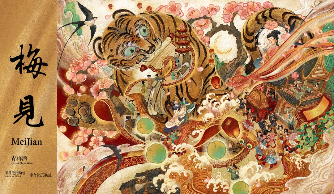 在去年虎年礼盒中,她设计了《青梅上河图》,老虎口吐卷轴,讲述煮酒论英雄等题材,呈现中华古老的繁华实景。
