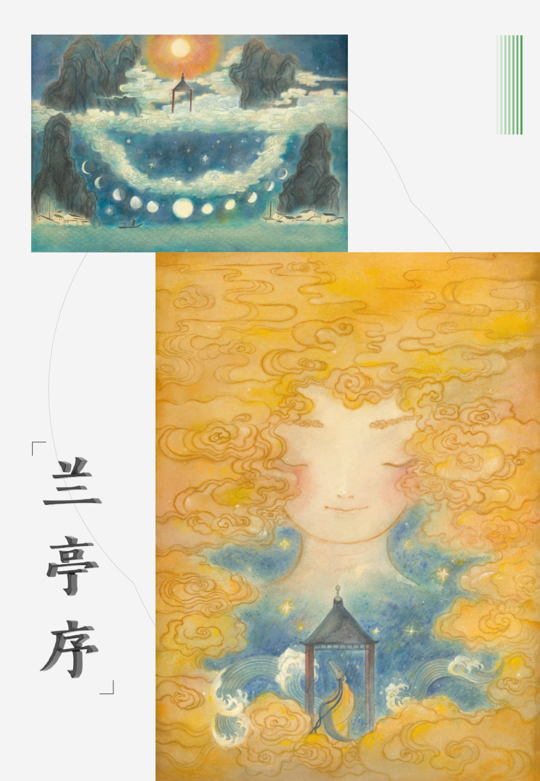 她还创作了《木兰辞》《兰亭序》等知名传统题材,在《兰亭序》中她以水彩和颜彩纯手绘的传统作画方式呈现中国传统意向,温柔的笔触、清新的配色展示出全新的国风。