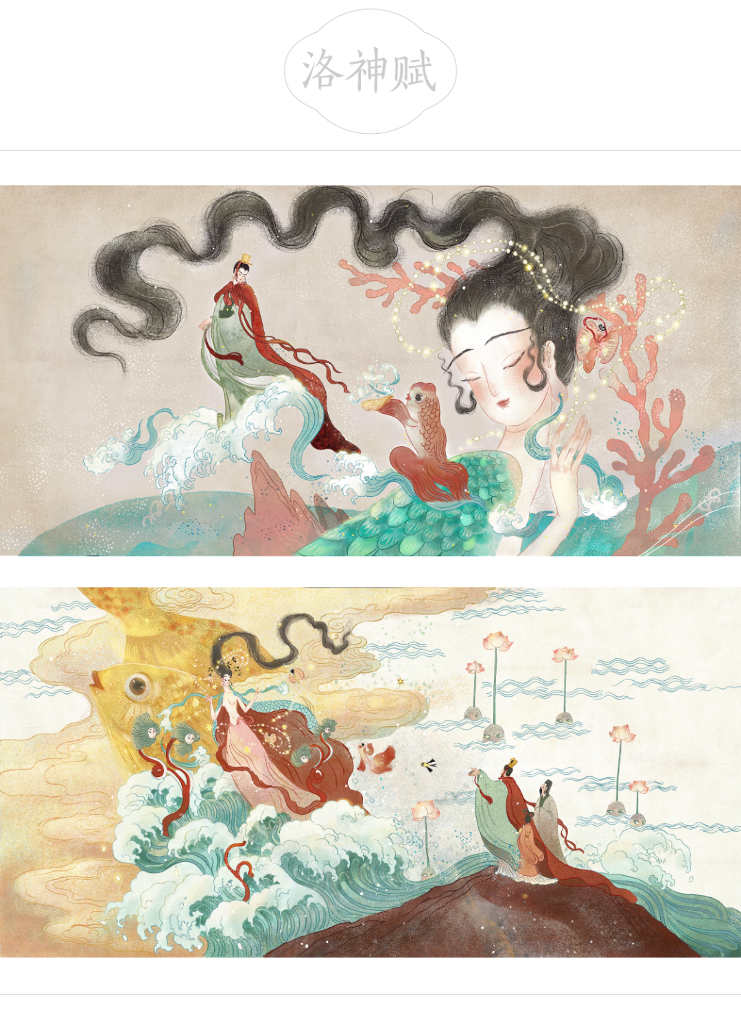 她创作的《洛神赋》将中国传统画风与现代的漫画技艺结合,在人物上描绘古典的轮廓和服饰,构图上采用扁平式构图和西式构图融合,呈现多元融合的风格。铅笔勾线后电脑上色,呈现出精致、有层次、色彩饱满的视觉美感。